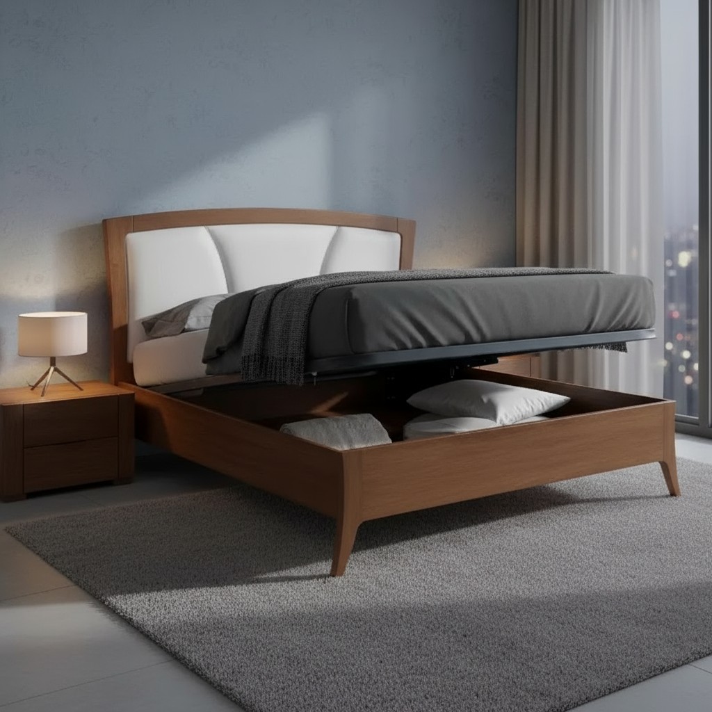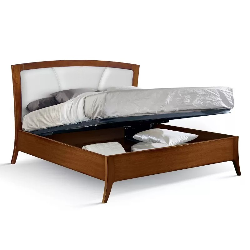 Letto matrimoniale in legno massello con testata in ecopelle sagomata e struttura lineare con gambe a sciabola. Questa Versione con contenitore è solida e robusta. letto dalla linea elegante e di classe , con una lavorazione impunturata nella parte centrale della testata. La qualità adoperata dei materiali nella realizzazione di questo letto ne garantisce e la lunga durata nel tempo.