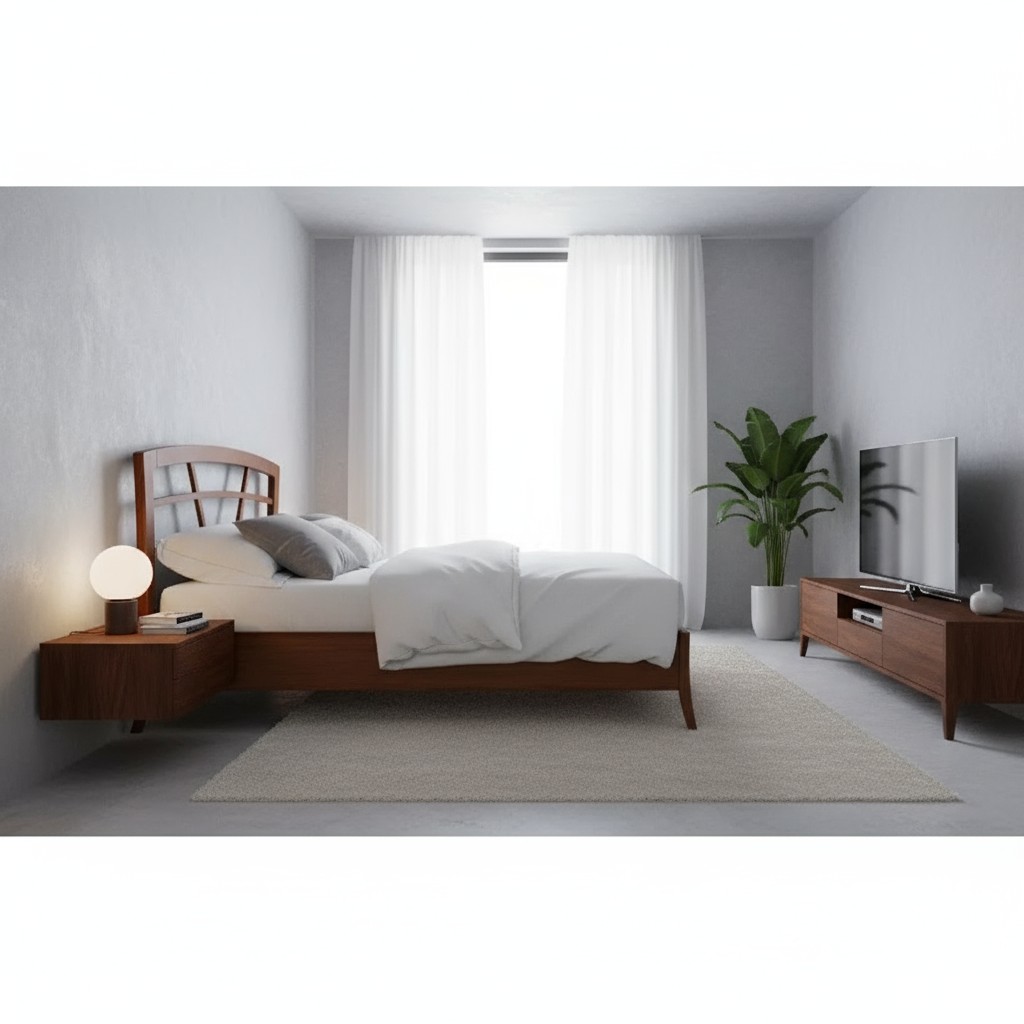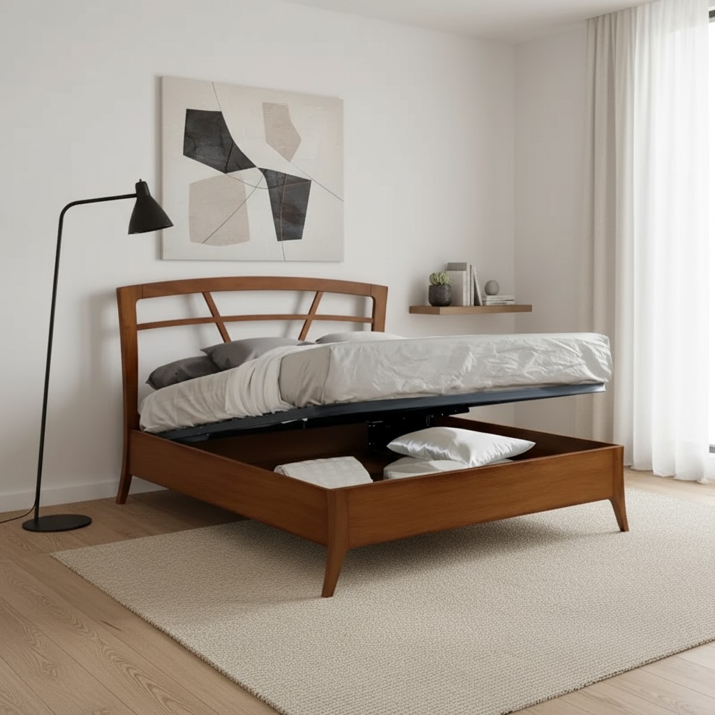 Letto matrimoniale in legno massello con testata traforata e sagomata con struttura lineare con gambe a sciabola. Questa Versione con contenitore è solida e robusta. letto dalla linea elegante e di classe , con una lavorazione geometrica traforata nella parte centrale della testata. La qualità adoperata dei materiali nella realizzazione di questo letto ne garantisce e la lunga durata nel tempo.