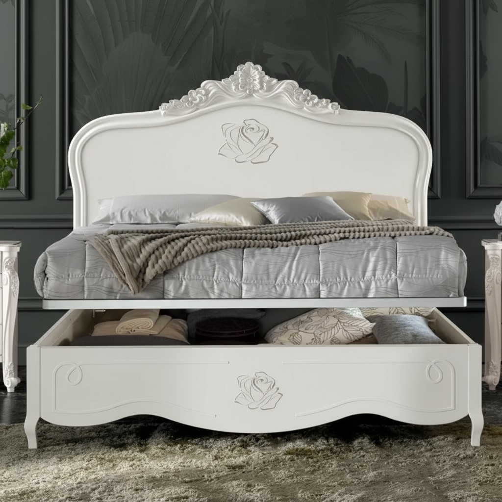 Letto matrimoniale barocco costruito in legno con contenitore, testata e pedata che proseguono con lavorazione centrale di una rosa in rilievo e con intagli floreali .Trova facilmente posto nella zona notte per ambienti con forte personalità. Unica nel suo genere con la sua particolare decorazione della rosa in rilievo creando un bellissimo contrasto con i motivi intagliati sulla testata, dando un tocco a un' atmosfera dallo stile romantico.