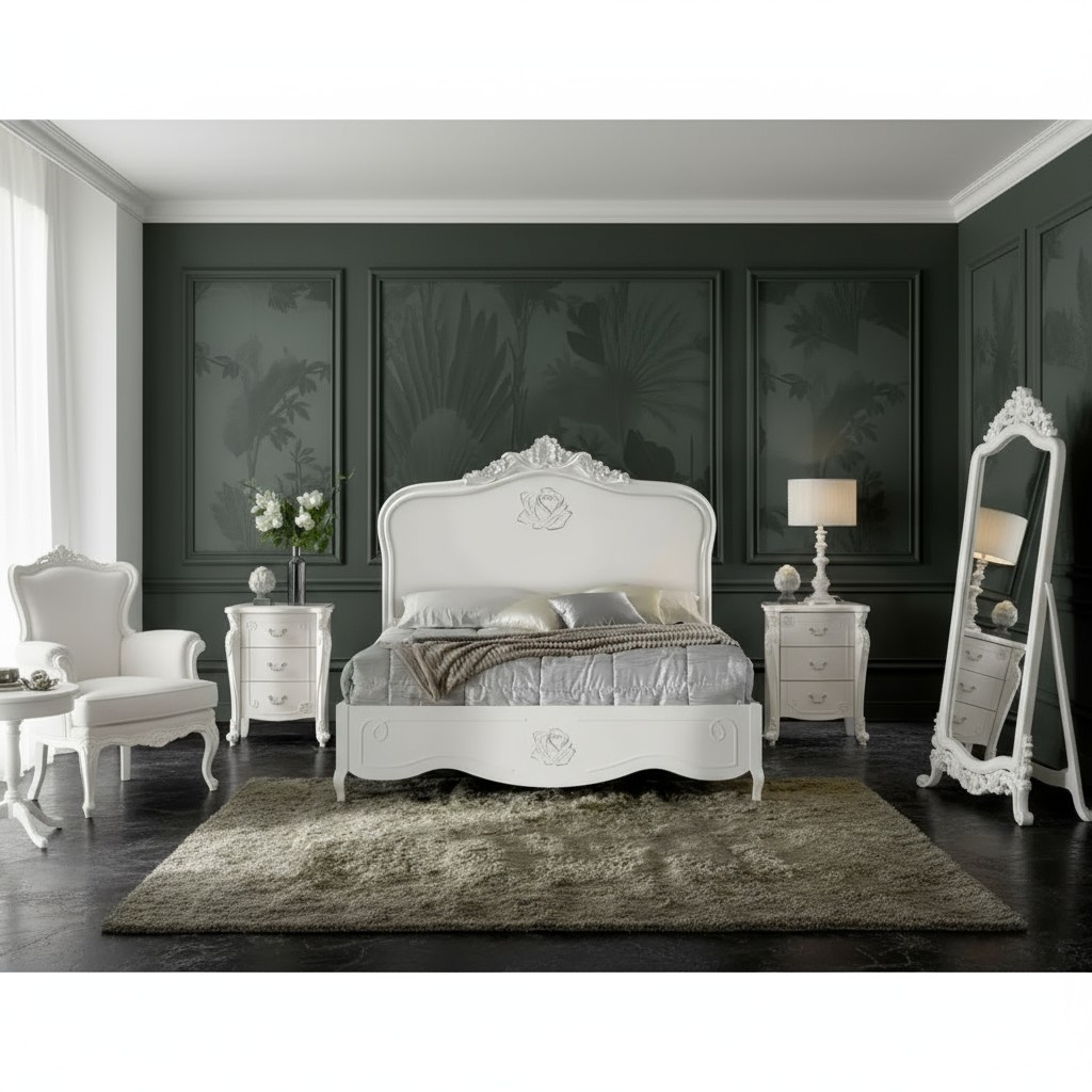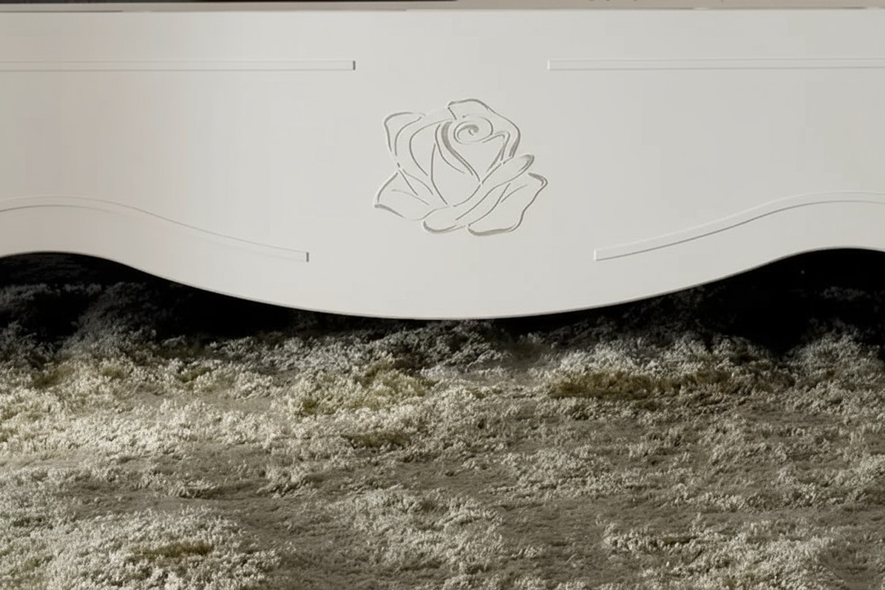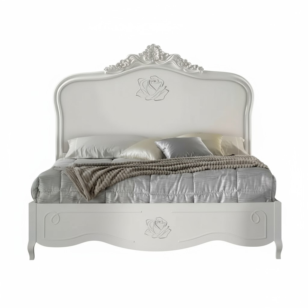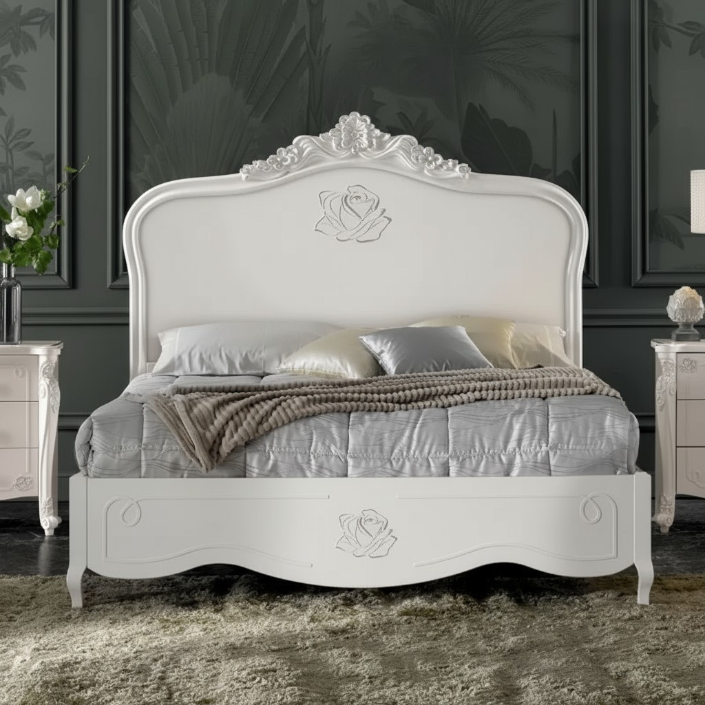 Letto matrimoniale barocco costruito in legno, testata e pedata che proseguono con lavorazione centrale di una rosa in rilievo e con intagli floreali .Trova facilmente posto nella zona notte per ambienti con forte personalità. Unica nel suo genere con la sua particolare decorazione della rosa in rilievo creando un bellissimo contrasto con i motivi intagliati sulla testata, dando un tocco a un' atmosfera dallo stile romantico.