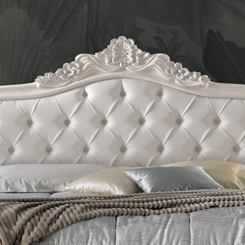 Letto matrimoniale classico costruito in legno, testata che prosegue con lavorazione centrale imbottita in capitonnè e intagli floreali .Trova facilmente posto nella zona notte per ambienti con forte personalità. Unica nel suo genere con la sua particolare testata imbottita creando un bellissimo contrasto con la decorazione di una rosa in rilievo, dando un tocco a un' atmosfera dallo stile romantico.