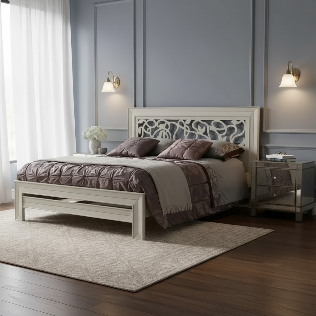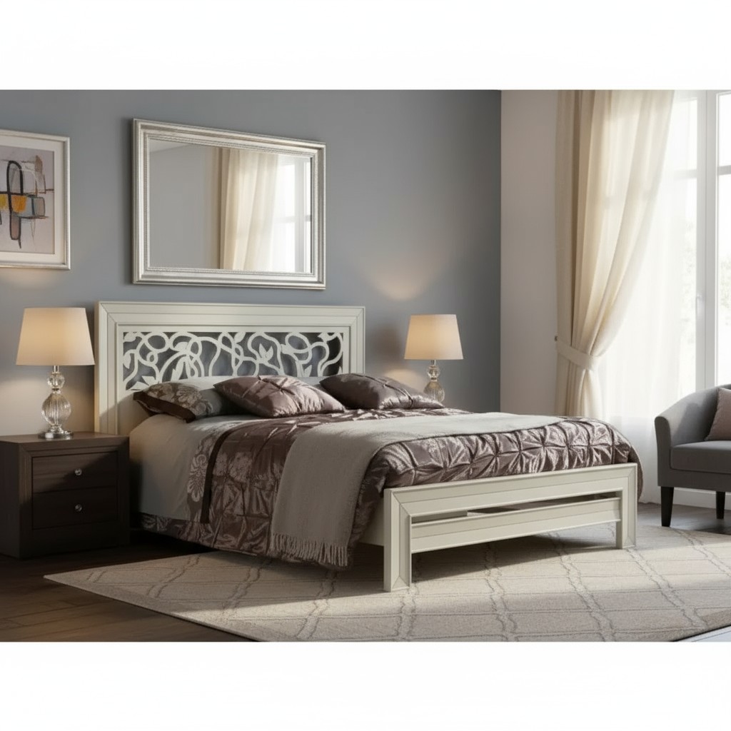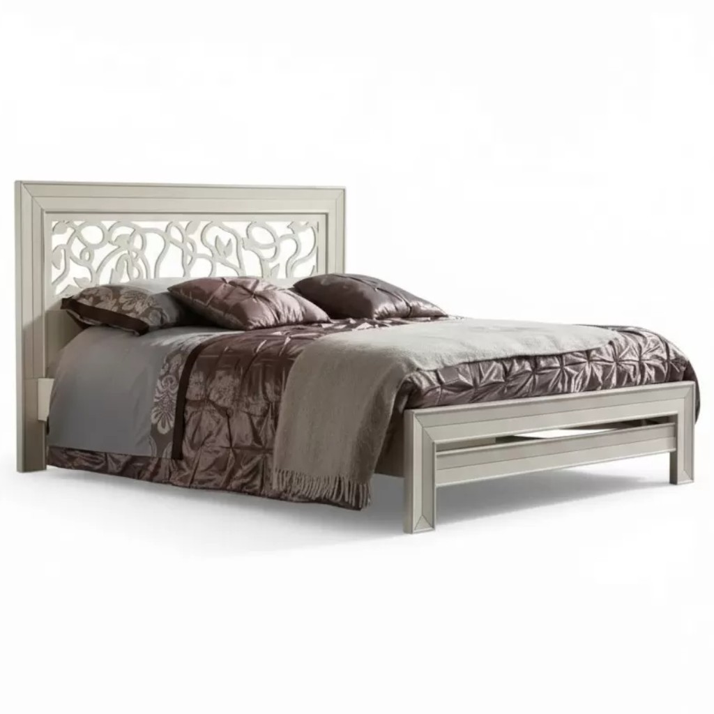 Letto matrimoniale in legno massello con testata traforata e struttura riquadrata . Questa Versione ha il giroletto, solida e robusta. letto dalla linea elegante e di classe , con una lavorazione a traforo con motivi floreali inserito nella parte centrale della testata. La qualità adoperata dei materiali nella realizzazione di questo letto ne garantisce e la lunga durata nel tempo.
