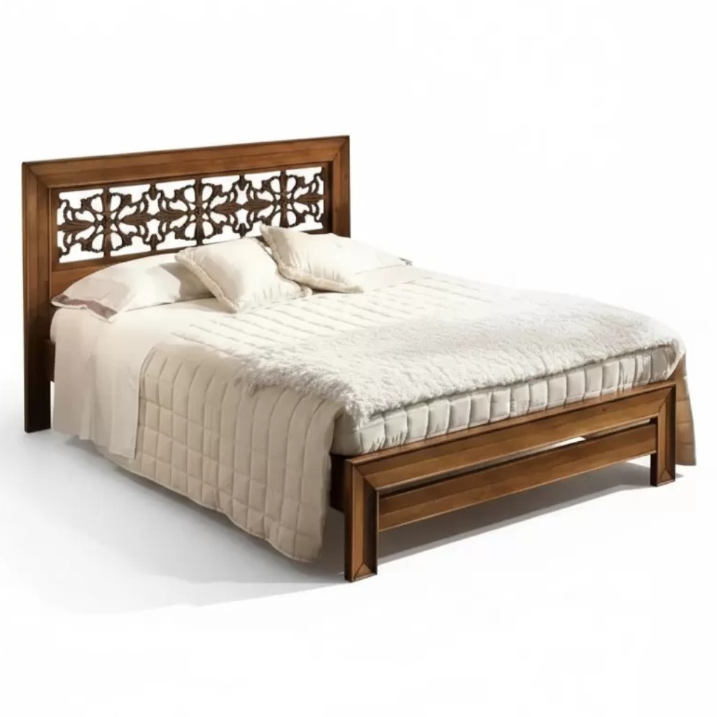 Letto matrimoniale in legno massello con testata traforata e pedata riquadrata. Questa Versione con il giroletto è solida e robusta. Letto dalla linea elegante e di classe con una lavorazione traforata con motivi floreali nella parte centrale della testata. La qualità adoperata dei materiali nella realizzazione di questo letto ne garantisce e la lunga durata nel tempo.