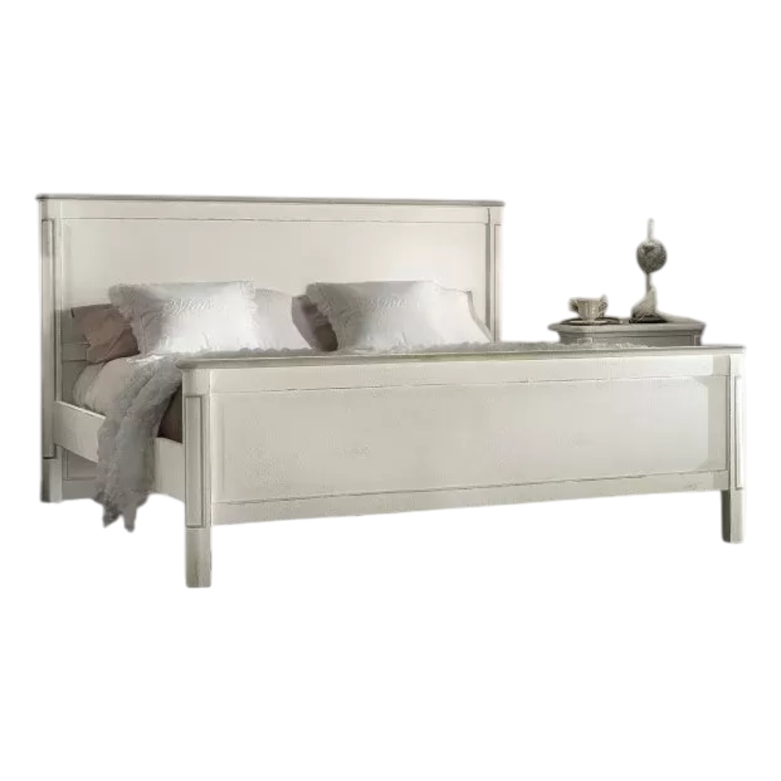 Il letto è bianco con profili grigio provenzale lungo le colonne.