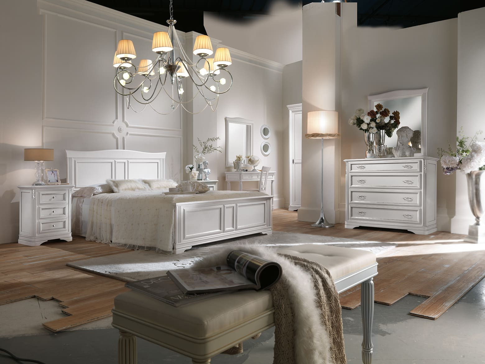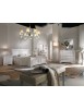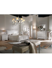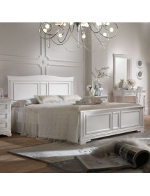 Letto matrimoniale con testata sagomata e spalle leggermente intagliate. La testata sagomata è completata da un triplo riquadro presente nella parte centrale, ripreso anche nella pediera del letto. La pediera riprende lo stile del comò e del comodino con uno zoccolo importante ma alleggerito dalla sagomatura.