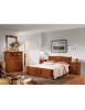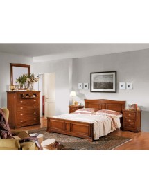 Letto matrimoniale con testata sagomata e spalle leggermente intagliate. La testata sagomata è completata da un triplo riquadro presente nella parte centrale, ripreso anche nella pediera del letto. La pediera riprende lo stile del comò e del comodino con uno zoccolo importante ma alleggerito dalla sagomatura.