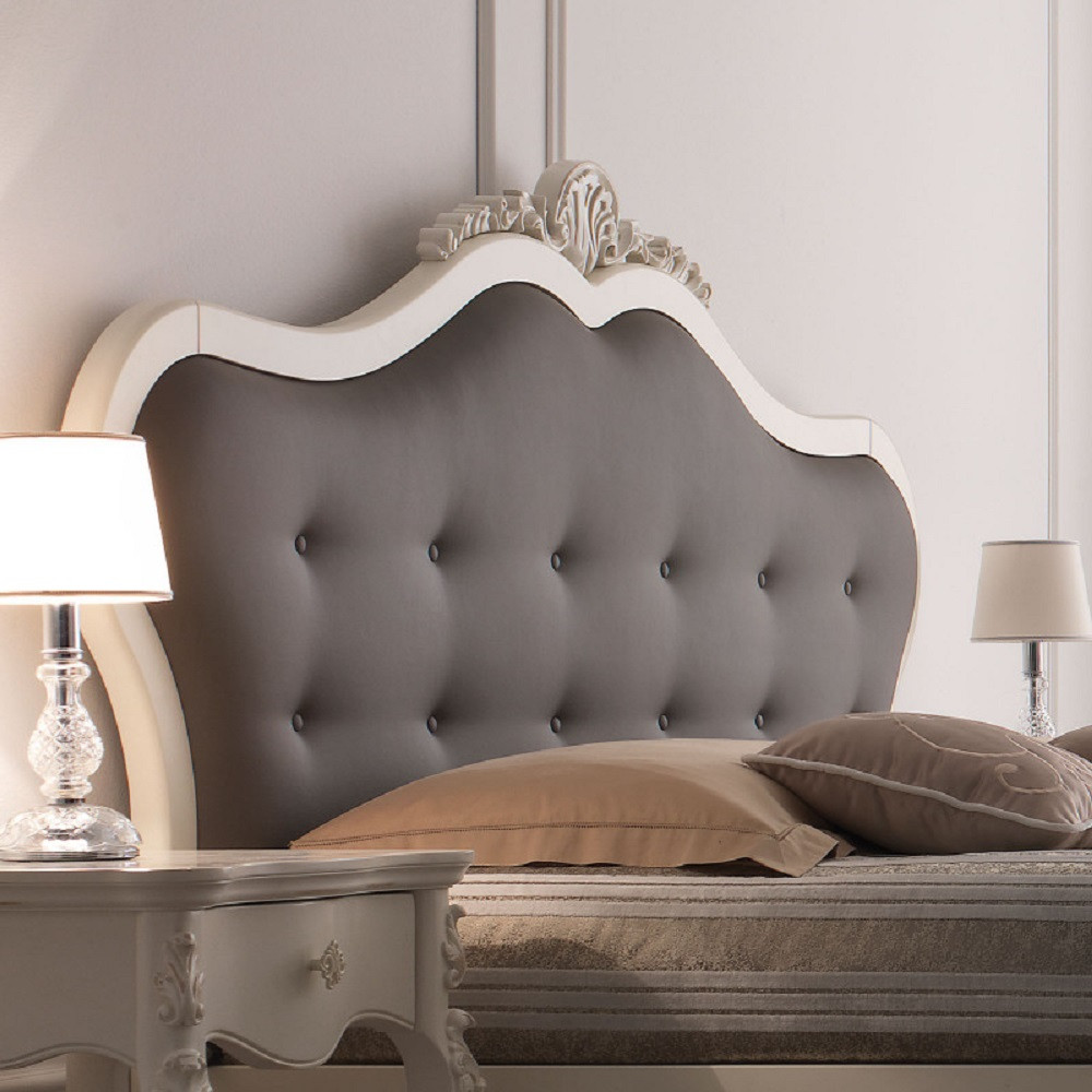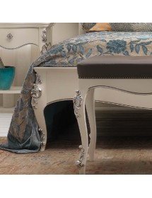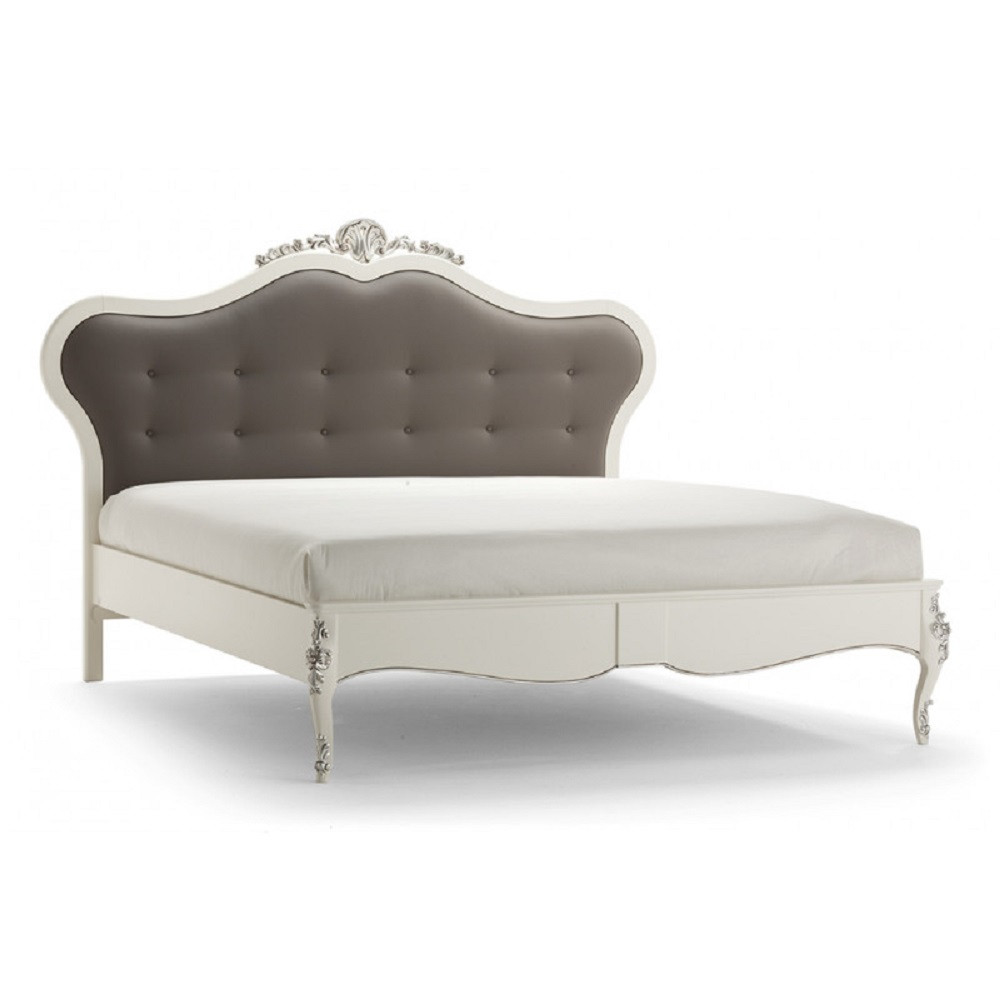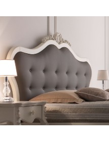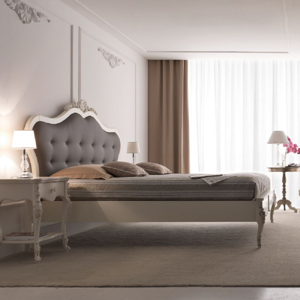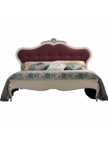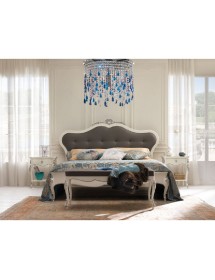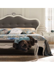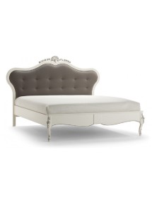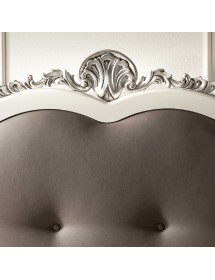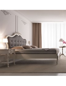 Elegante e raffinato letto a due piazze, con testata imbottita in ecopelle .Testata sagomata con intaglio a conchiglia nella parte centrale e imbottitura a lavorazione capitonnè. Pediera bassa alzata da terra da gambette sagomate ed intagliate. Le forme delicate ma importanti sono decorate da dettagli intagliati.