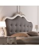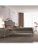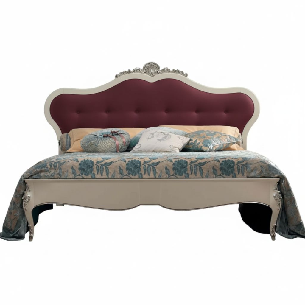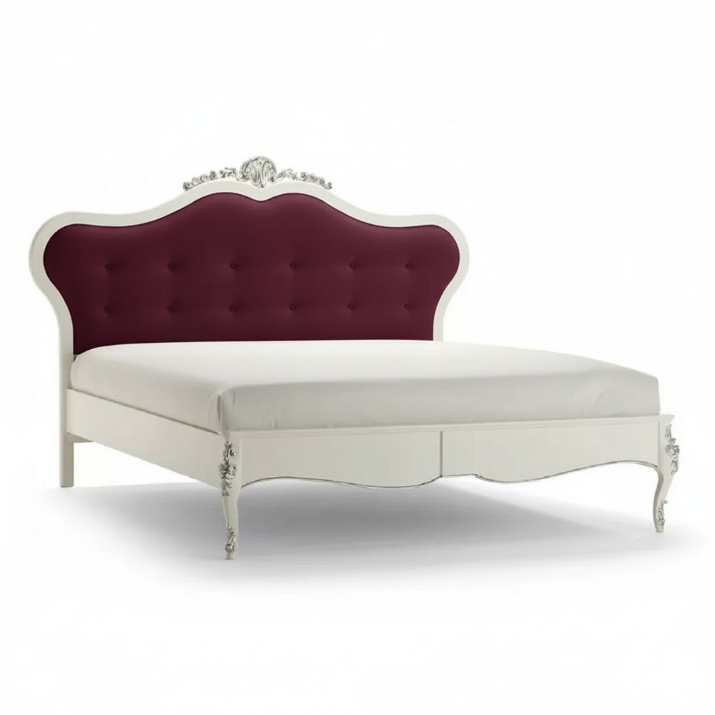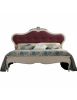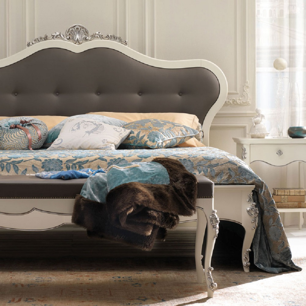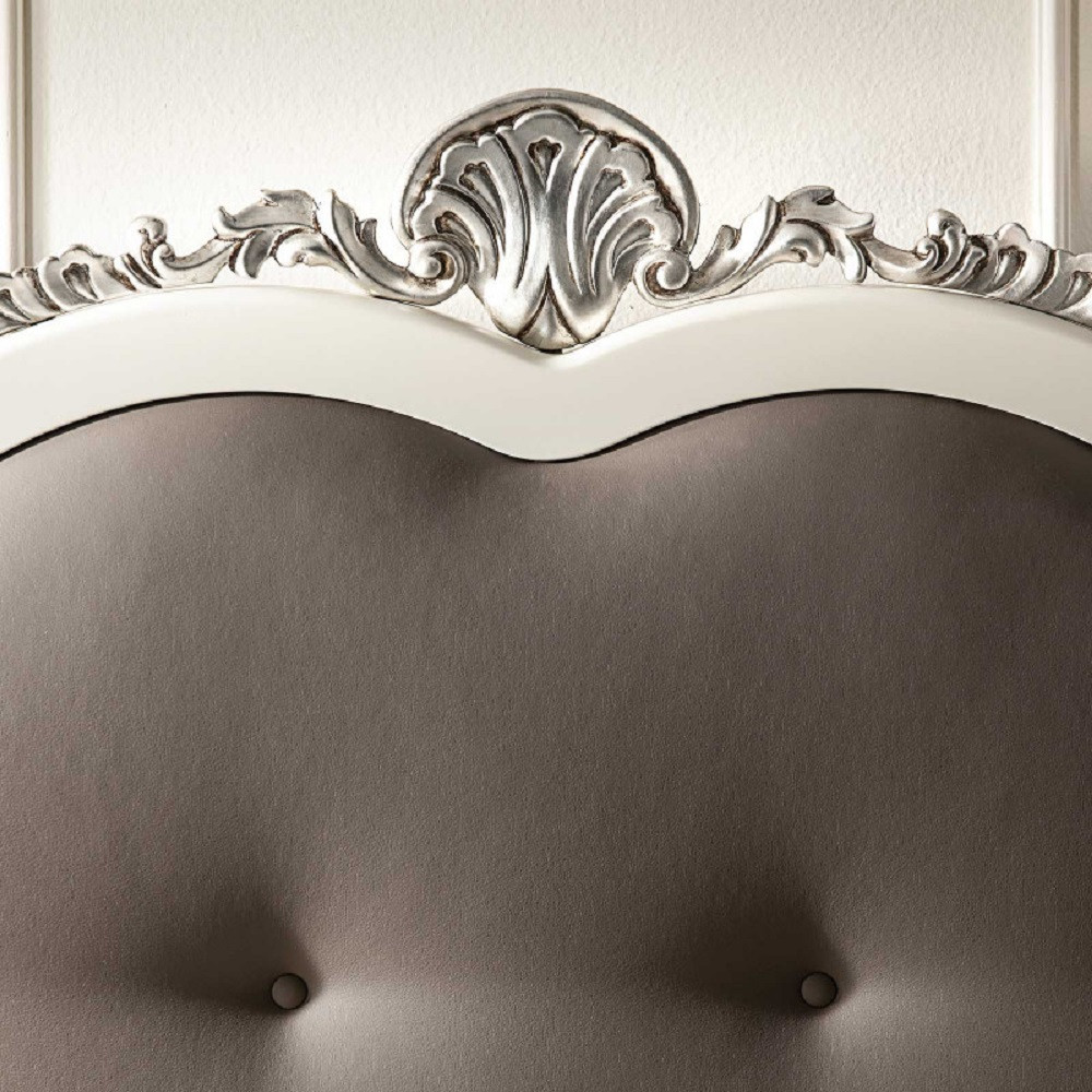 Elegante e raffinato letto a due piazze, con testata imbottita in ecopelle .Testata sagomata con intaglio a conchiglia nella parte centrale e imbottitura a lavorazione capitonnè. Pediera bassa alzata da terra da gambette sagomate ed intagliate. Le forme delicate ma importanti sono decorate da dettagli intagliati.