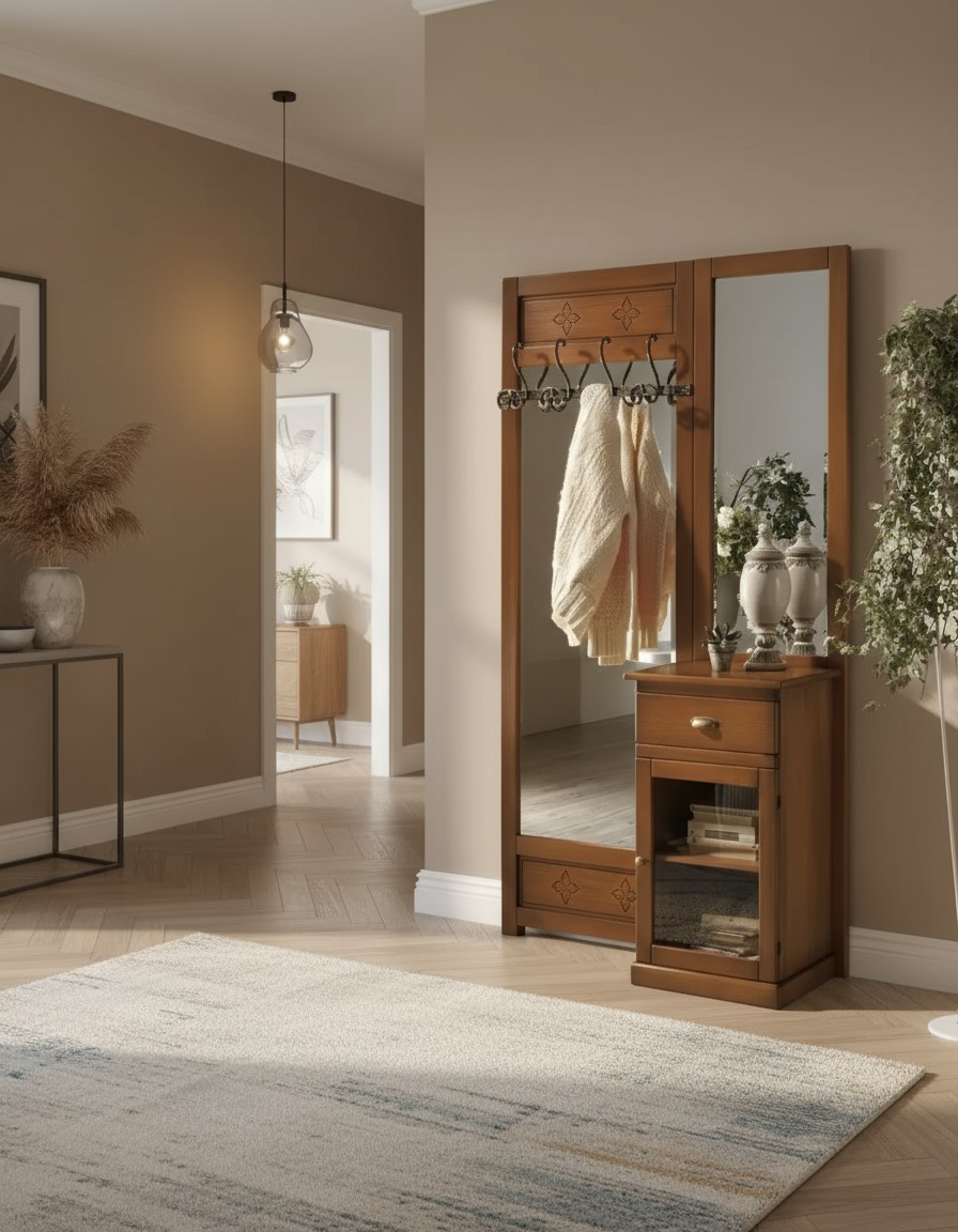 Mobile per ingresso appendiabiti. Un mobile contenitore elegante, funzionale e molto versatile . La sua struttura è realizzata in legno, senza dubbio un complemento ideale per corridoi, corridoi o camere da letto. Dispone di un appendiabiti con specchio con ganci da poter avere vestiti e scarpe sempre in ordine, ottenendo così un soggiorno pulito e organizzato. La linea del mobile è una collezione di mobili artigiani realizzati esclusivamente in Italia. La cura dei particolari e l' impatto estetico rendono questa linea di mobili unica e esclusiva nel suo genere .