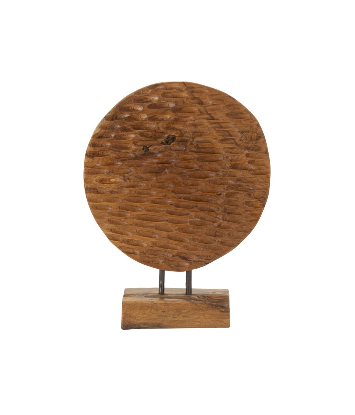 Scultura unica in teak riciclato, che combina la forma di una moneta con superfici irregolari. Ogni intaglio riflette la maestria artigianale e la bellezza dell'imperfezione, rendendo questo pezzo un simbolo di autenticità e armonia.