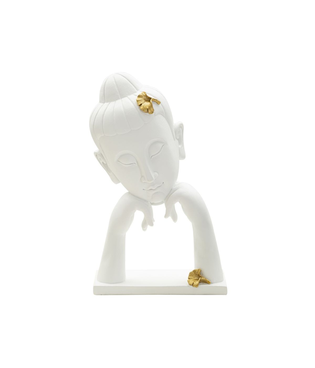 Elegante testa di buddha finemente decorata con foglie dorate.