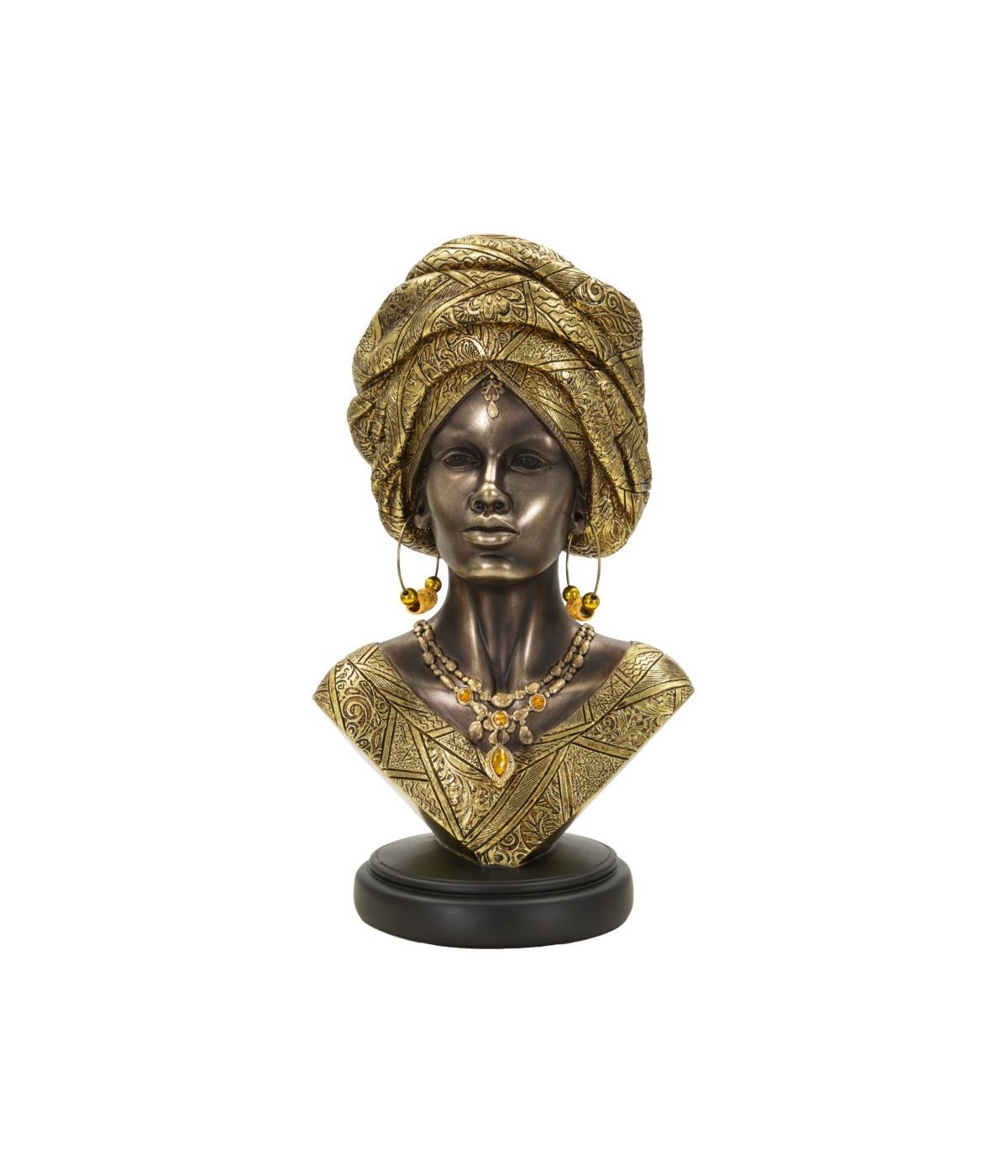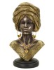 Busto di donna con turbante e vestiti che richiamano le tribù africane.