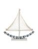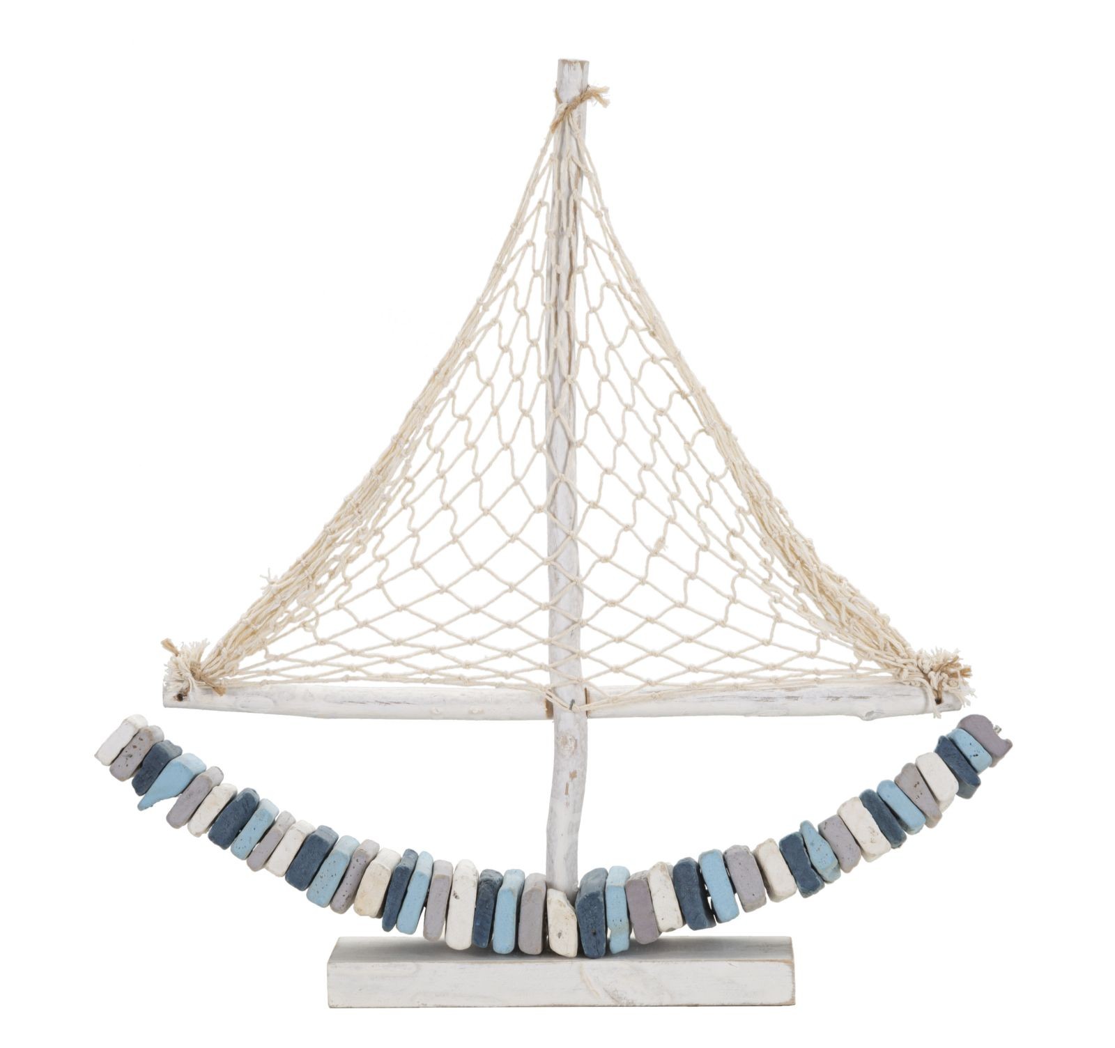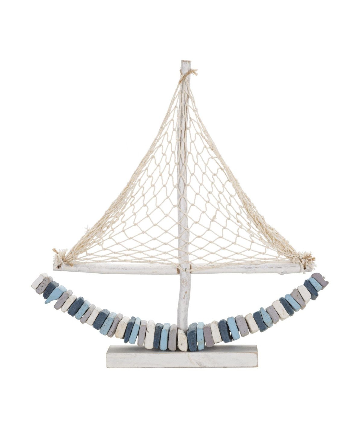 Scultura di barca a vela in legno con base. La vela è realizzata con una rete in tessuto mentre lo scafo è realizzato con piccoli tasselli di legno.