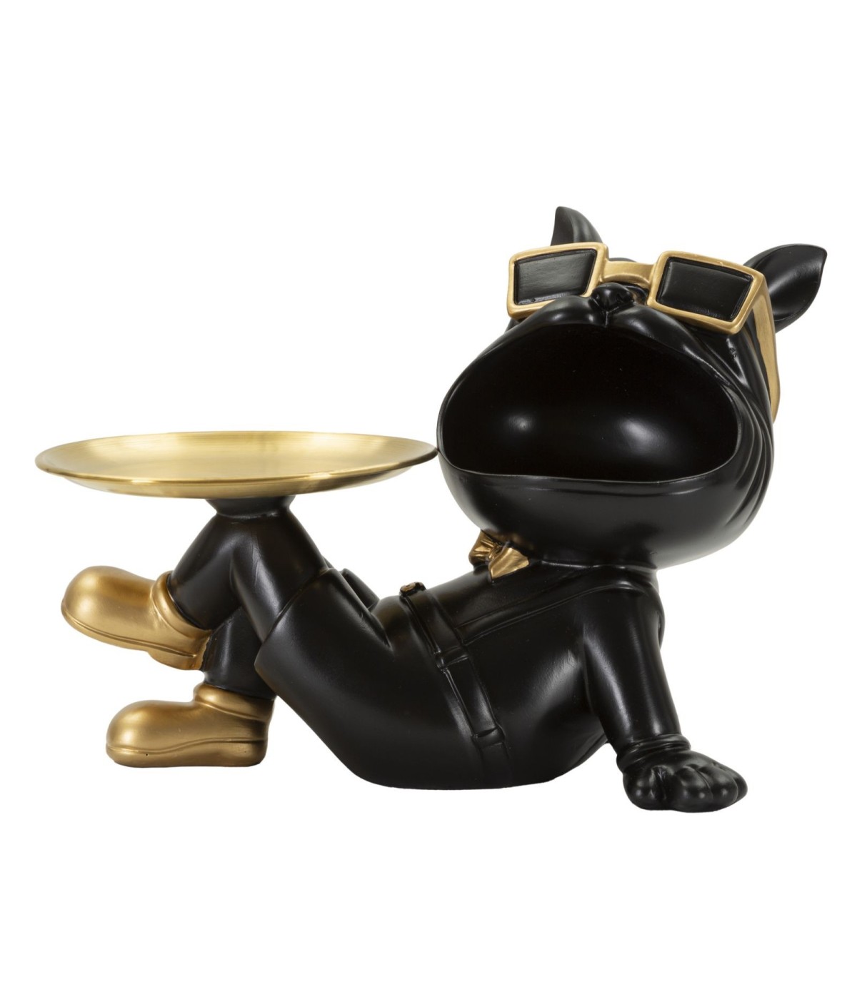 Simpatica statuetta a forma di cane con occhiali da sole e un papillon dorato dal design ispirato ai cartoon. Con le zampe sostiene un pratico vassoio dorato che può essere utilizzato come porta oggetti.