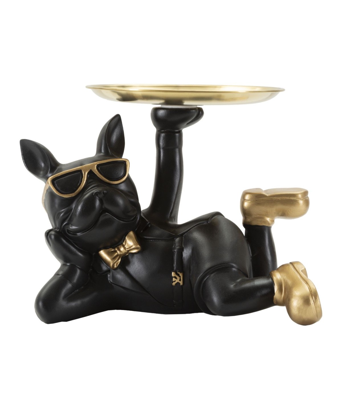 Simpatica statuetta a forma di cane con occhiali da sole e un papillon dorato dal design ispirato ai cartoon. Con le zampe sostiene un pratico vassoio dorato che può essere utilizzato come porta oggetti.