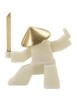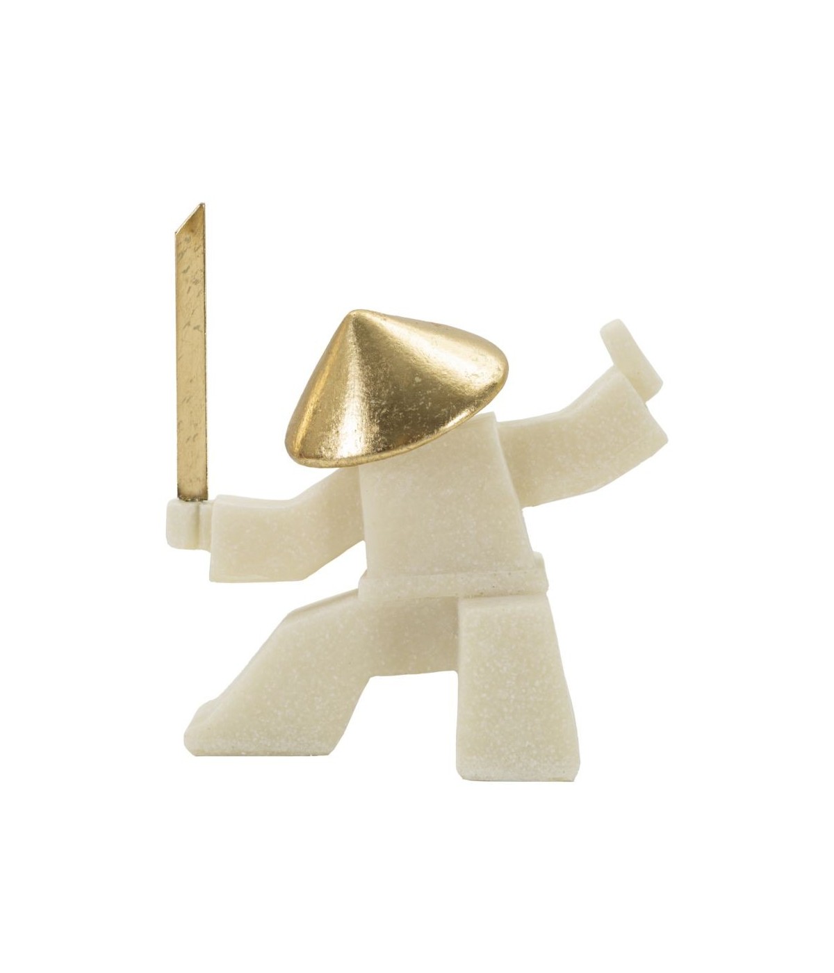 Statua di samurai con dettagli dorati, in posa con cappello e spada, emana determinazione e potenza.