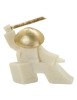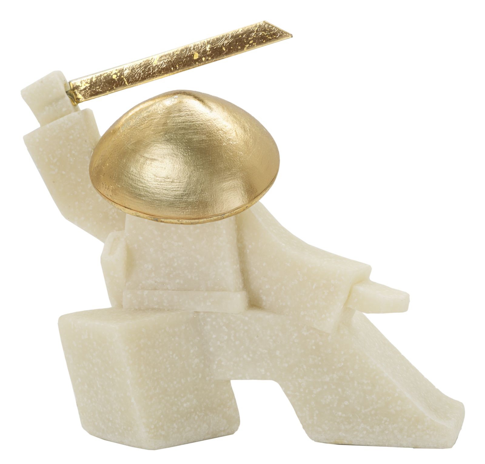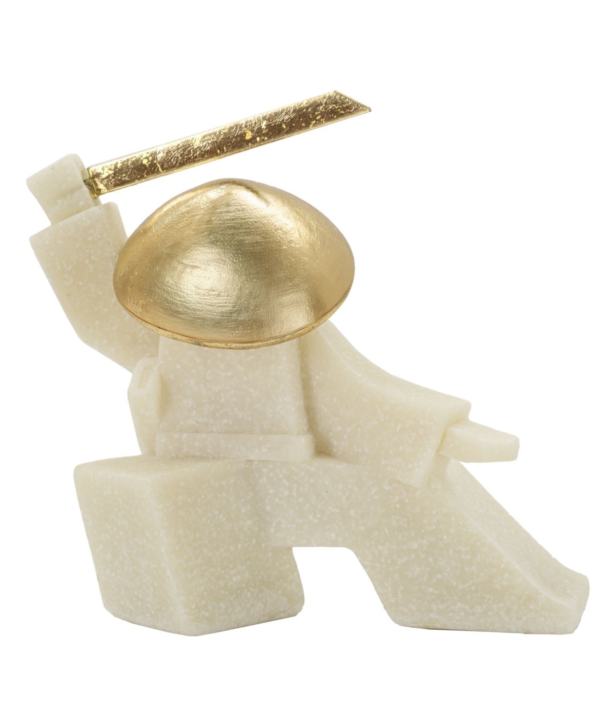 Statua di samurai con dettagli dorati, in posa con cappello e spada, emana determinazione e potenza.