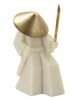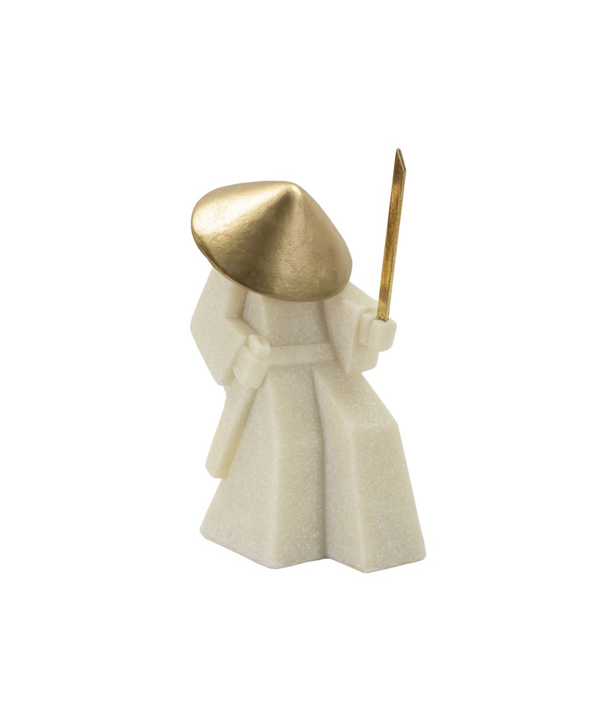 Statua di samurai con cappello e spada dorati, in una dinamica posizione di difesa, ideale per collezionisti e appassionati di storia giapponese.
