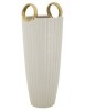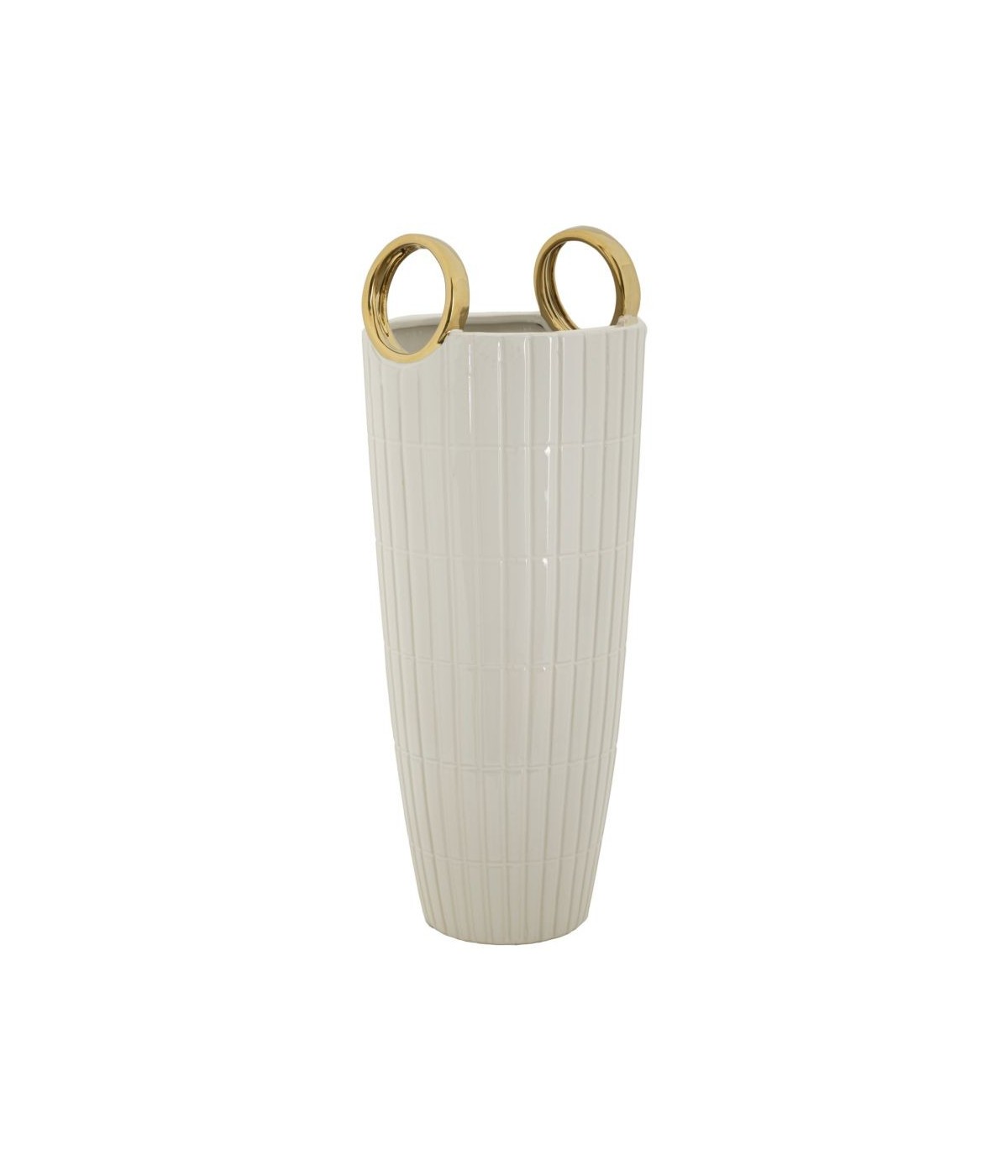 Vaso in ceramica bianca con eleganti quadretti in rilievo, impreziosito da due anelli dorati.
