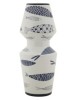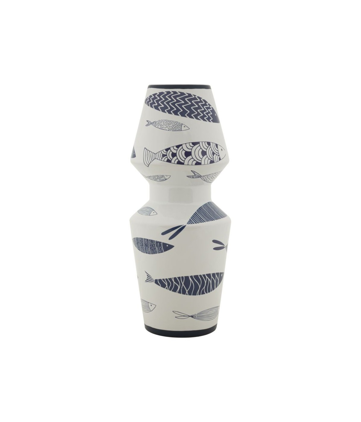 Vaso in ceramica bianca con pesci e decorazioni blu che creano un insieme che richiama il mare.