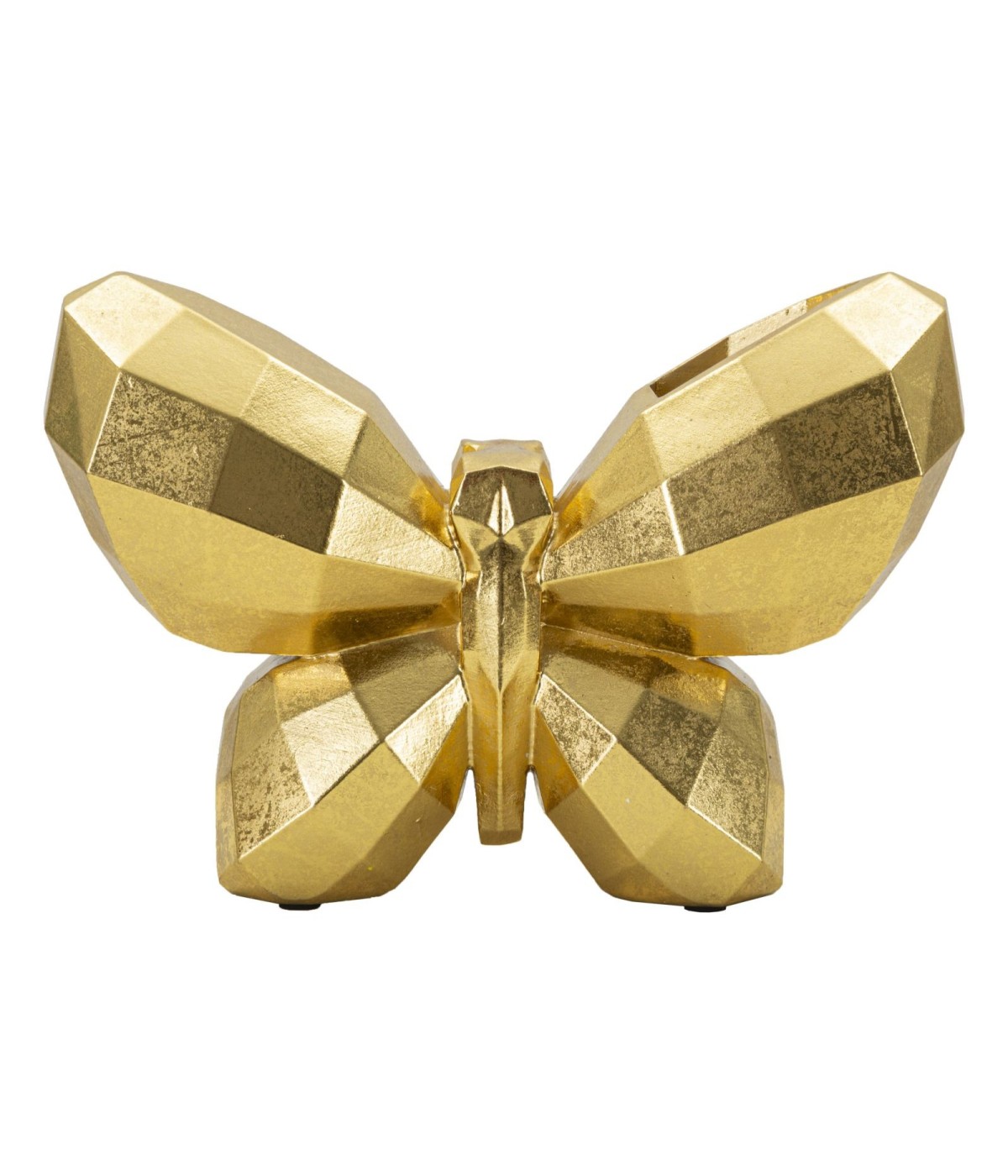 Elegante vaso in resina dorata a forma di farfalla dal design squadrato che richiama il cubismo.