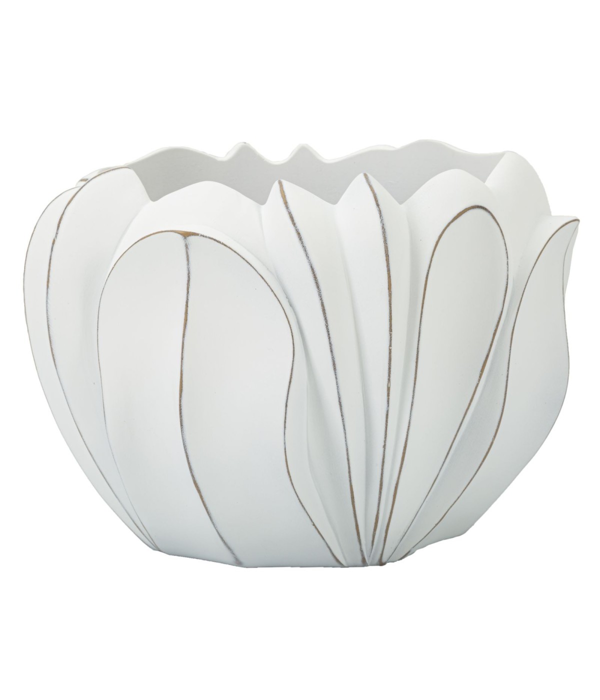 Cachepot rotondo in ceramica dal design morbido e sinuoso con eleganti decorazioni in rilievo.
