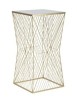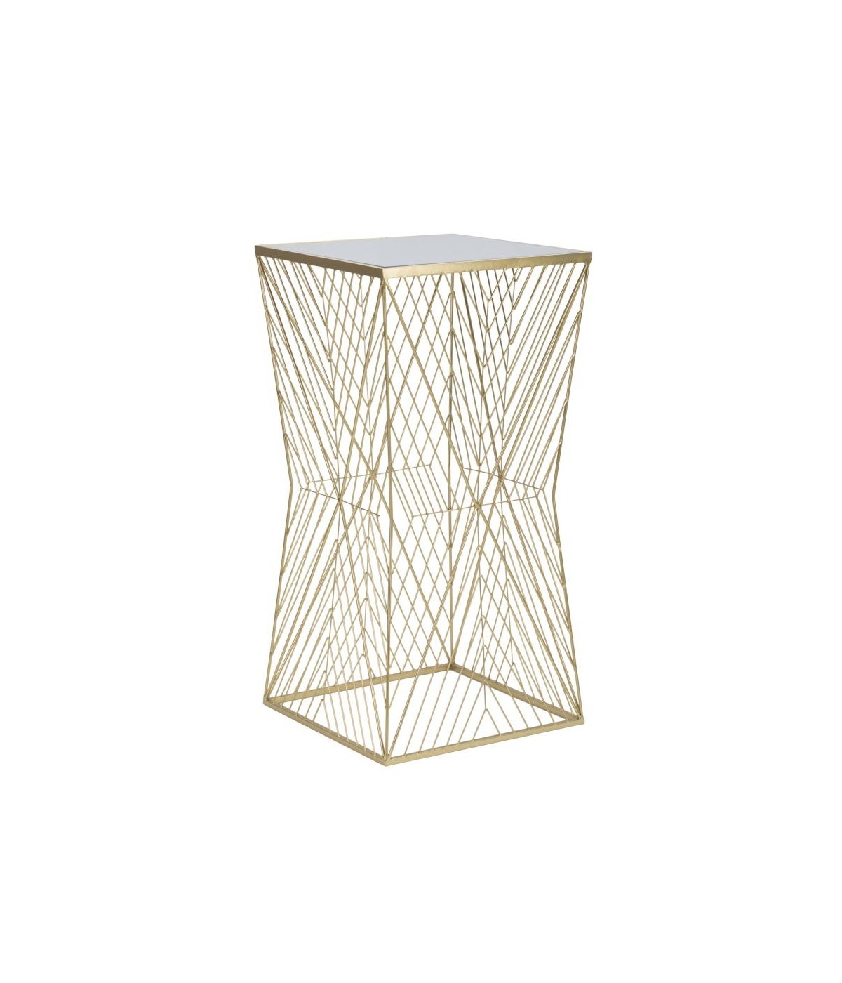Tavolo portatelefono quadrato in metallo dorato dalle linee geometriche che creano un perfetto intreccio. Completo di piano in vetro a specchio.