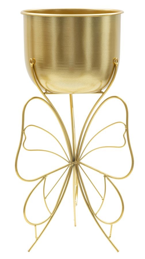 Porta vasi in metallo dorato con base a farfalla: eleganza e leggerezza si fondono in un connubio di bellezza e grazia.