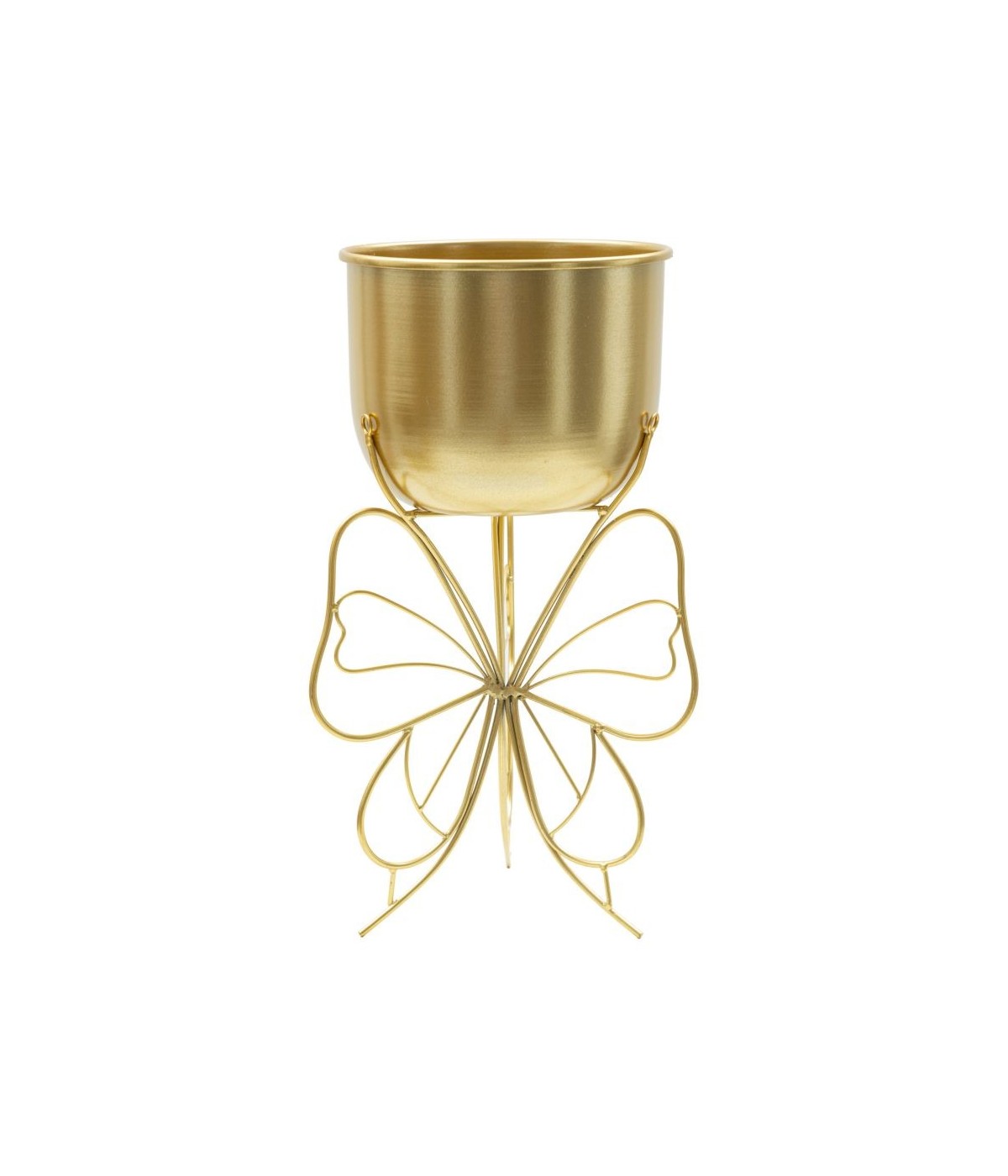 Porta vasi in metallo dorato con base a farfalla: eleganza e leggerezza si fondono in un connubio di bellezza e grazia.