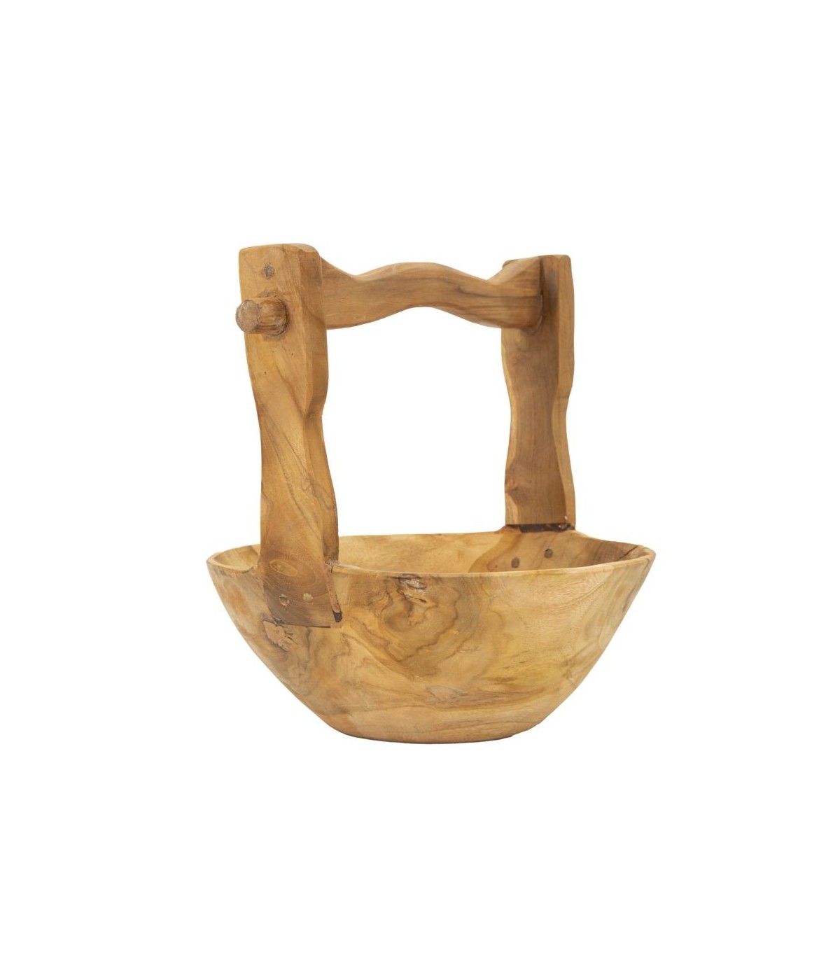 Elegante svuotatasche in teak riciclato, con la forma di un cesto e un manico artigianale. Unisce sostenibilità e raffinatezza in un pezzo unico e funzionale.