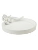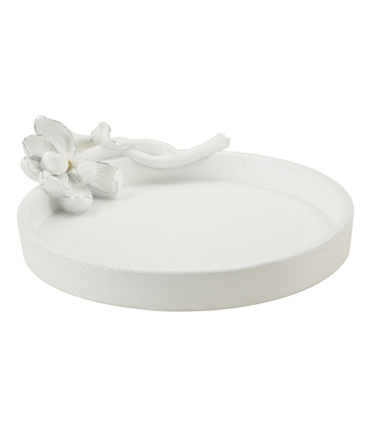 Semplice vassoio svuotatasche rotondo in resina bianca impreziosito da un fiore con eleganti finiture dorate e argentate.