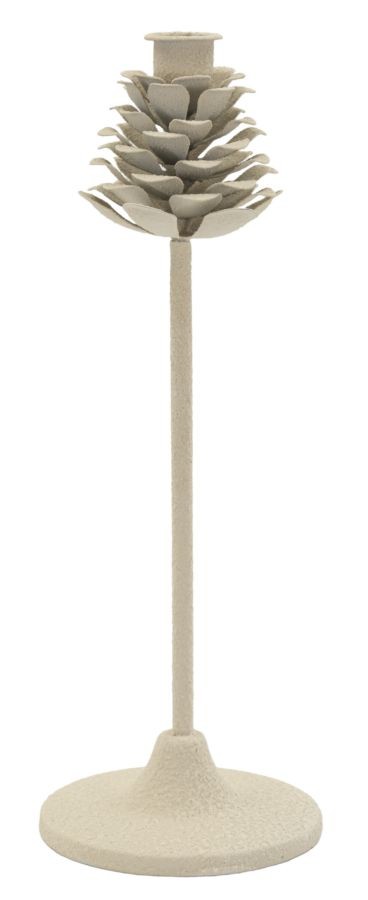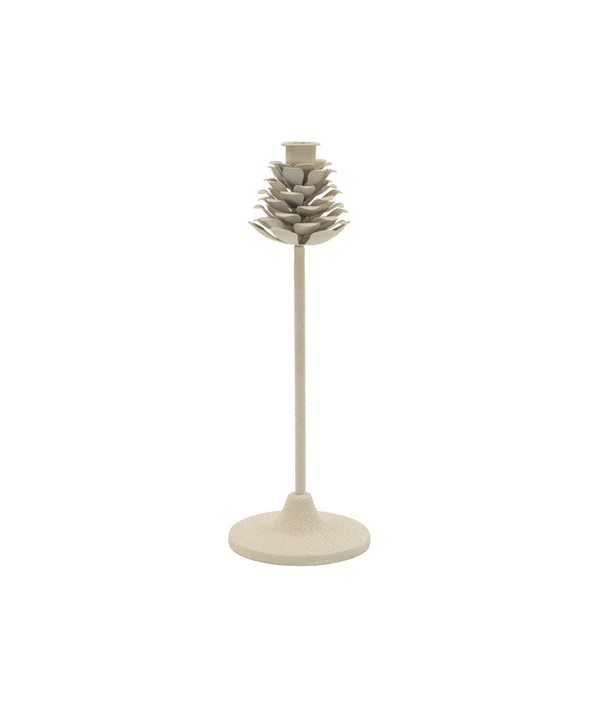 Ispirato alla forma di una pigna stilizzata, questo portacandela alto è una scultura naturale che richiama la foresta e dona verticalità alla composizione.