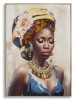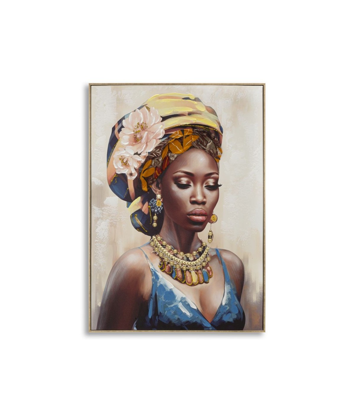 Dipinto su tela con intelaiatura in legno raffigurante una donna in abiti tradizionali e con turbante. Completo di cornice in metallo dorato.