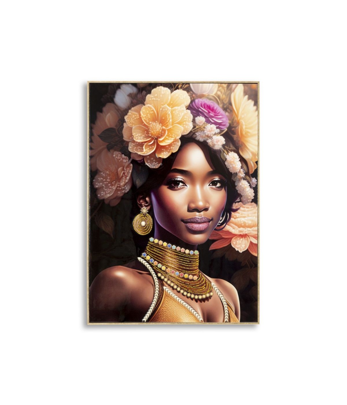 Dipinto su tela con intelaiatura in legno raffigurante una donna in abiti tradizionali e con fiori sulla testa. Completo di cornice in metallo dorato.