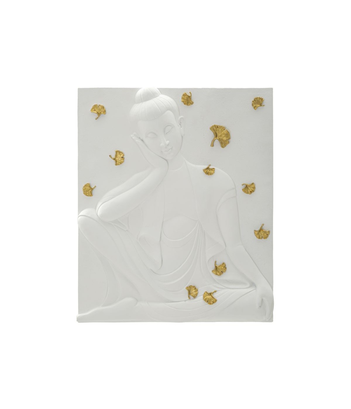 Pannello decorativo 3D da parete in resina raffigurante Buddha in rilievo con eleganti foglie decorative dorate.