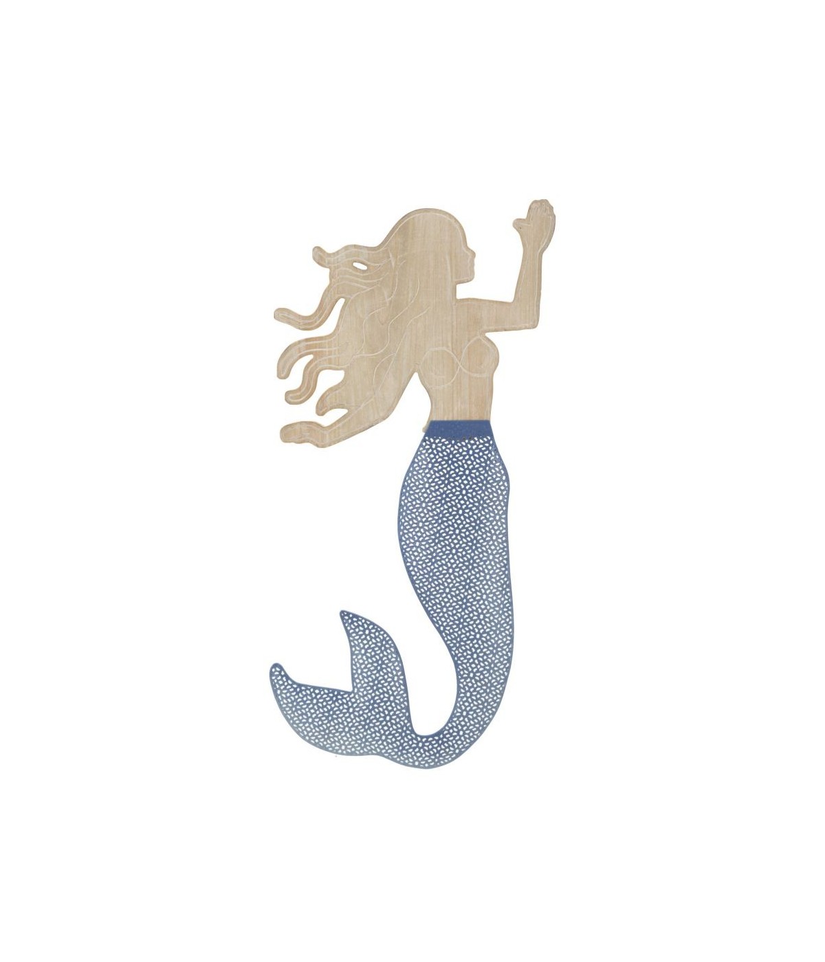 Pannello decorativo 3D da parete in metallo e legno raffigurante una sirena che nuota.