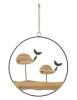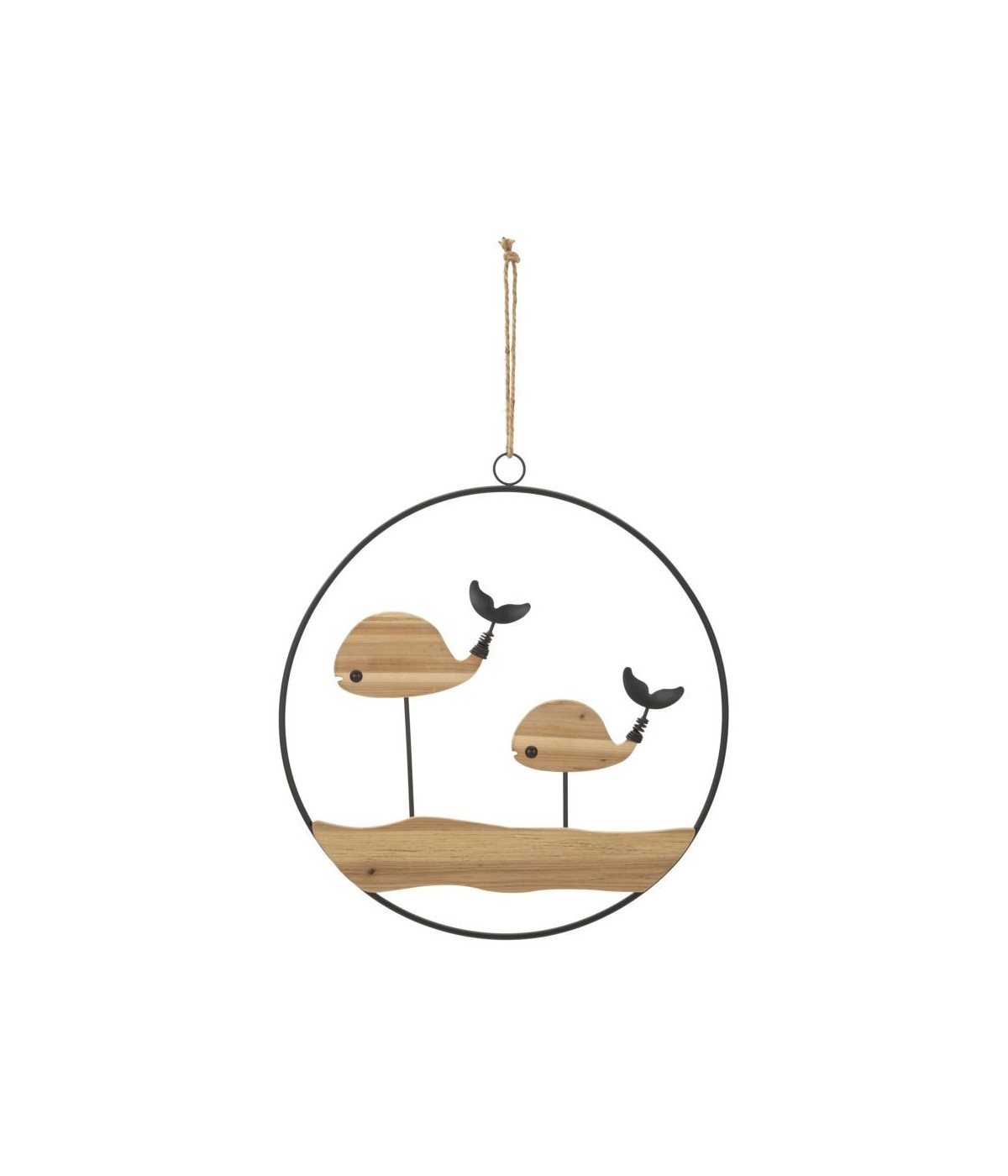 Pannello decorativo 3D da parete in metallo e legno raffigurante una simpatica coppia di balene racchiuse in una semplice cornice rotonda.