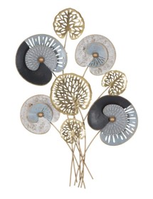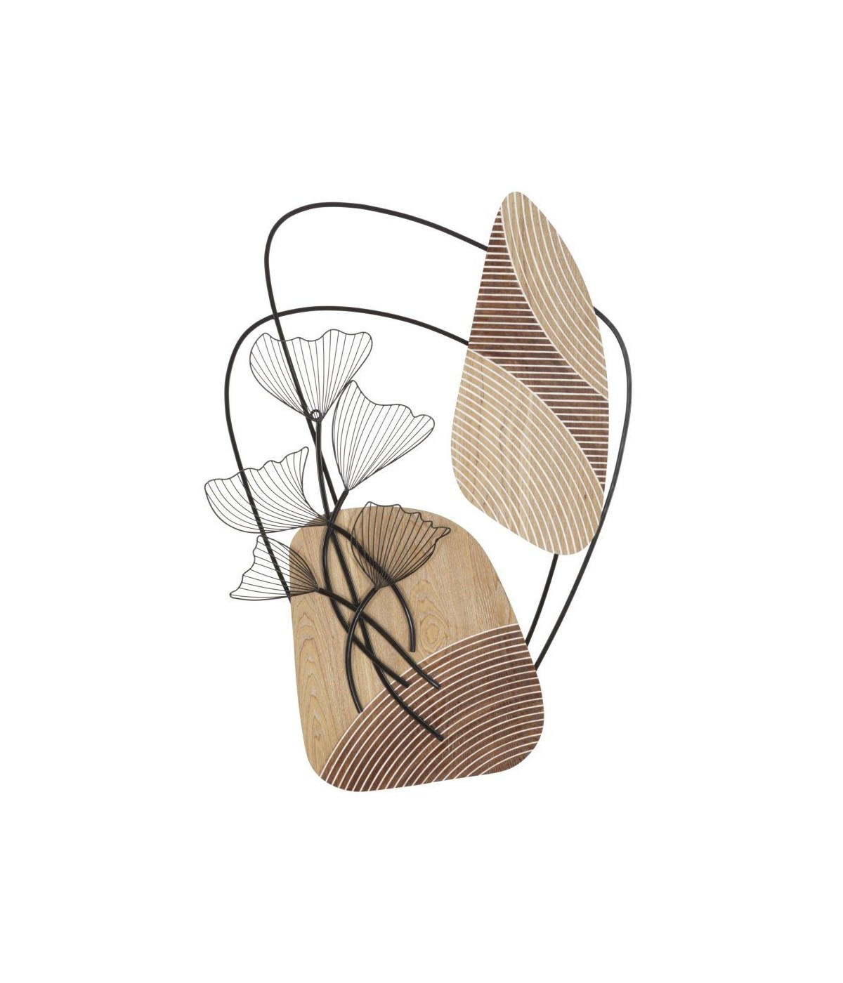 Pannello decorativo 3D da parete in metallo e legno dalle forme astratte e impreziosite da eleganti foglie.