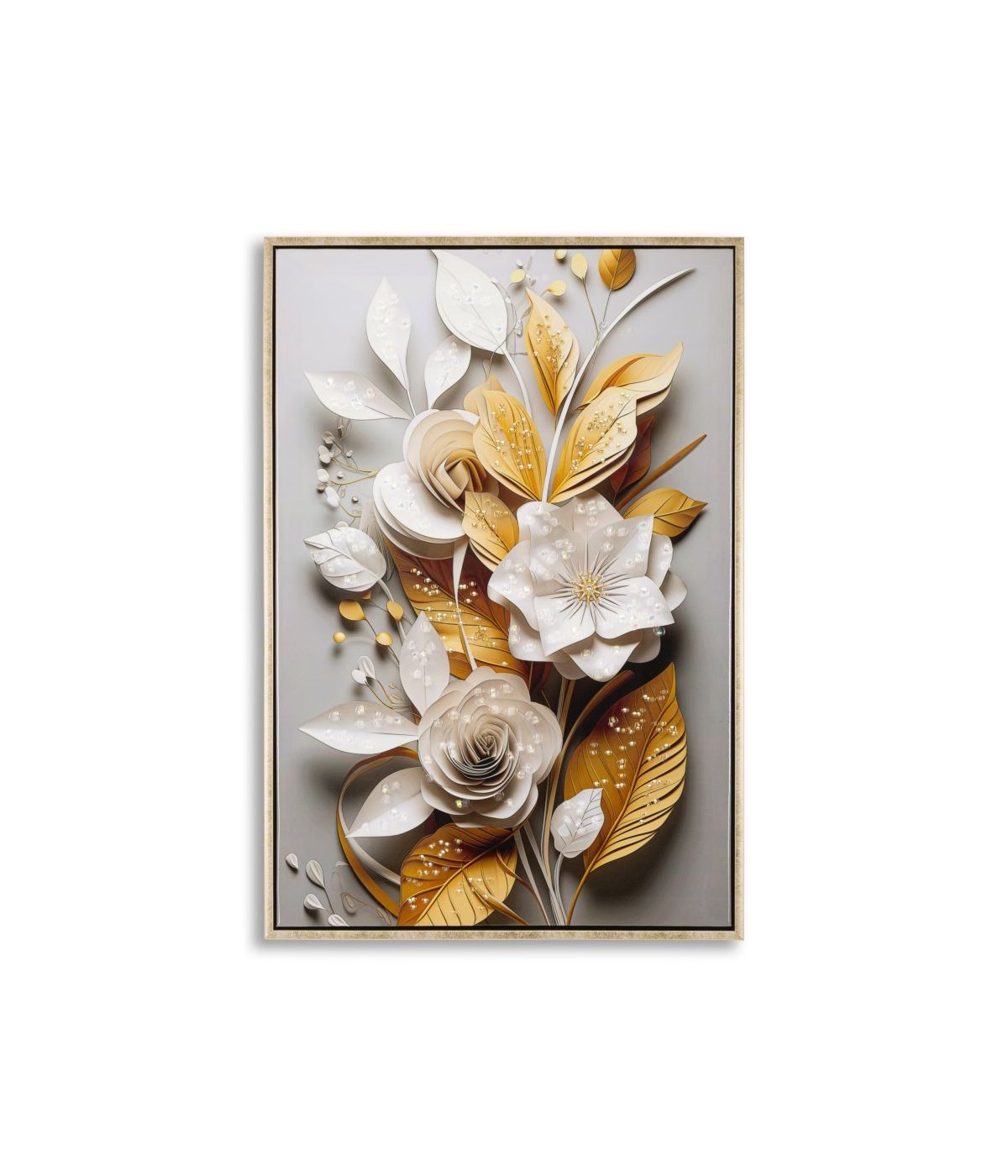 Dipinto su tela completo di telaio in legno e cornice in metallo oro. Fiori e foglie si intrecciano, creando un balletto di emozioni vibranti. Con applicazioni in rilievo.