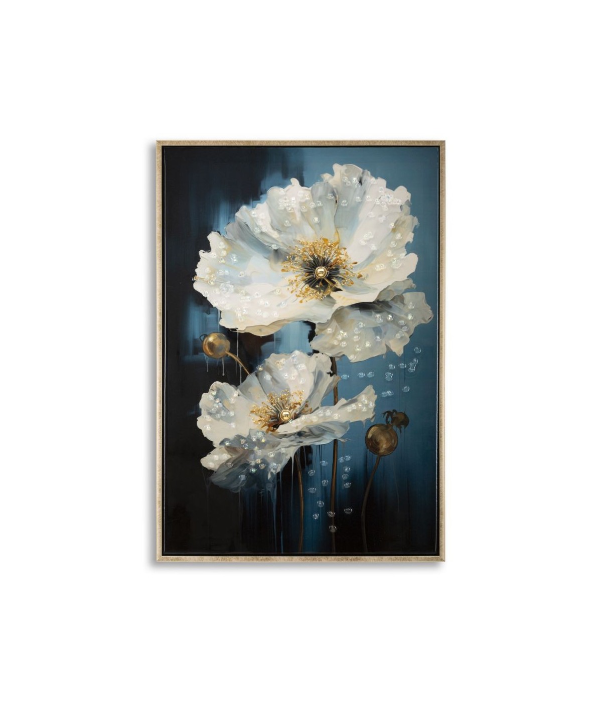 Dipinto su tela completo di telaio in legno e cornice in metallo oro che evoca freschezza e serenità primaverile. Con applicazioni in rilievo.