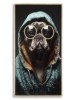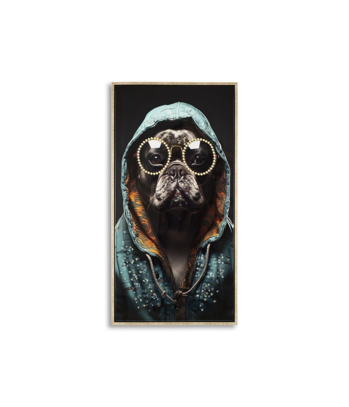 Dipinto su tela completo di telaio in legno e cornice dorata in metallo, raffigurante un bulldog con occhiali da sole, ideale per aggiungere stile e personalità a qualsiasi ambiente. Con applicazioni in rilievo.