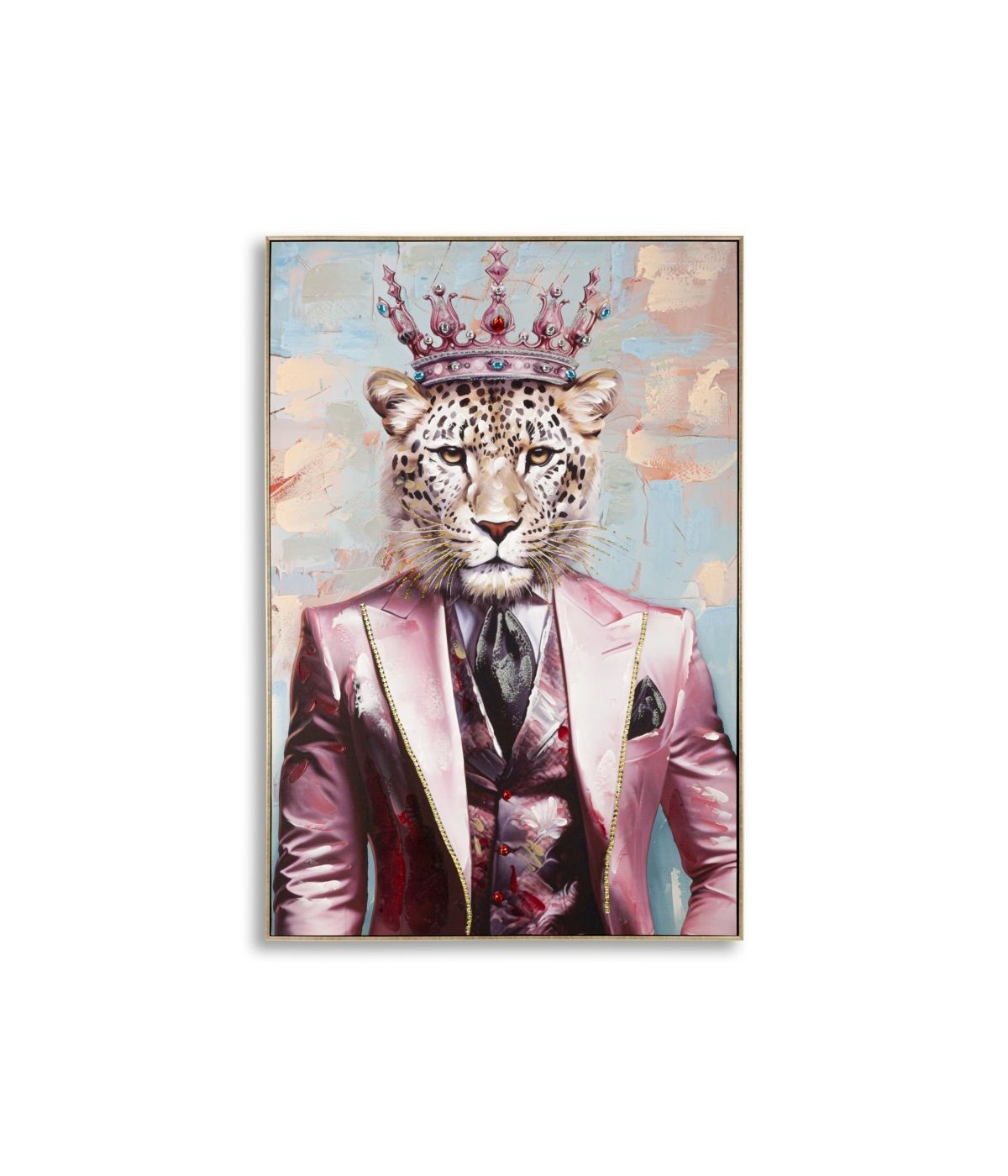 Dipinto su tela dai toni rosa con cornice in metallo dorato e telaio in legno. Leopardo che indossa una corona da re, stile elegante e regale, perfetto per arricchire qualsiasi ambiente con un tocco di maestosità. Con applicazioni in rilievo.