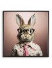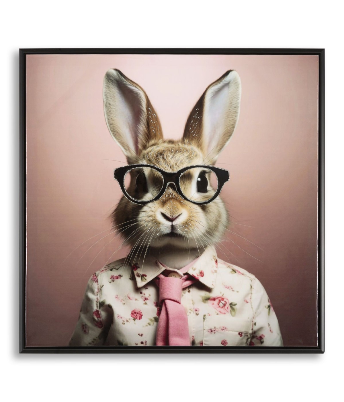 Dipinto su tela dai toni rosa con telaio in legno e cornice in metallo, coniglio con occhiali, perfetto per un tocco di originalità. Con applicazioni in rilievo.