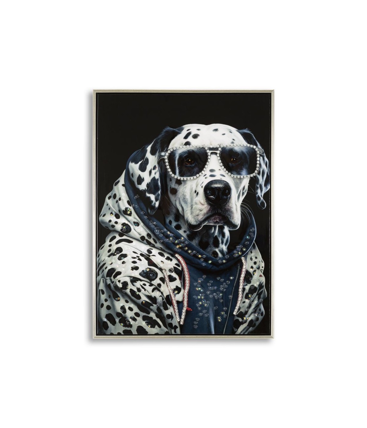 Dipinto su tela completo di telaio in legno e cornice in metallo argento. Cane dalmata con felpa e occhiali da sole, incorniciato in un'espressione di risolutezza e stile. Con applicazioni in rilievo.