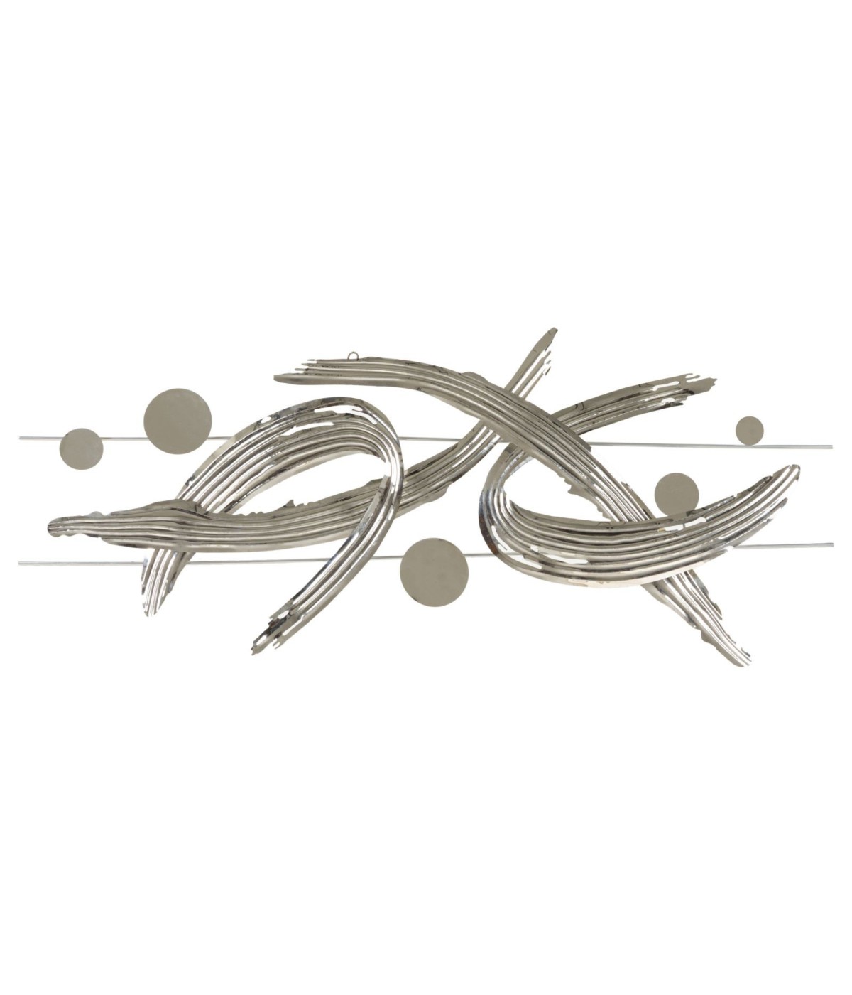 Pannello decorativo 3D da parete in metallo argento, con linee che esaltano l'equilibrio dinamico dell'arte moderna.
