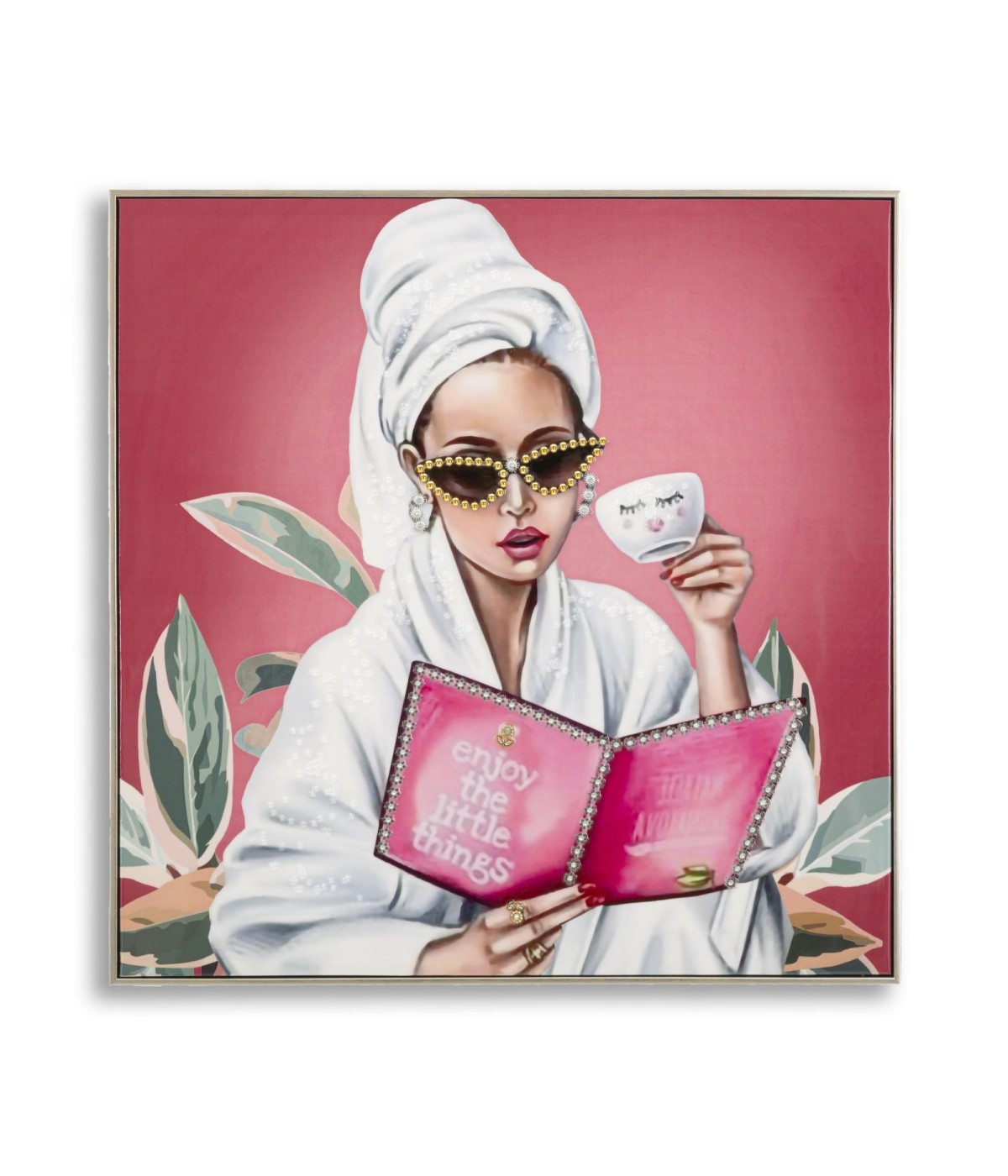 Dipinto su tela laccato con cornice Luxury Spa incarna eleganza e relax con un tocco glamour. La figura femminile, avvolta in un morbido accappatoio, con occhiali alla moda e una tazza di tè, trasmette un’atmosfera di lusso e benessere. Lo sfondo raffinato e i dettagli curati lo rendono perfetto per ambienti chic e sofisticati.
