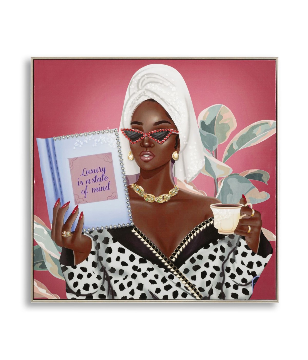 Dipinto su tela laccato con cornice Luxury Spa incarna eleganza e relax con un tocco glamour. La figura femminile, avvolta in un morbido accappatoio, con occhiali alla moda e una tazza di tè, trasmette un’atmosfera di lusso e benessere. Lo sfondo raffinato e i dettagli curati lo rendono perfetto per ambienti chic e sofisticati.