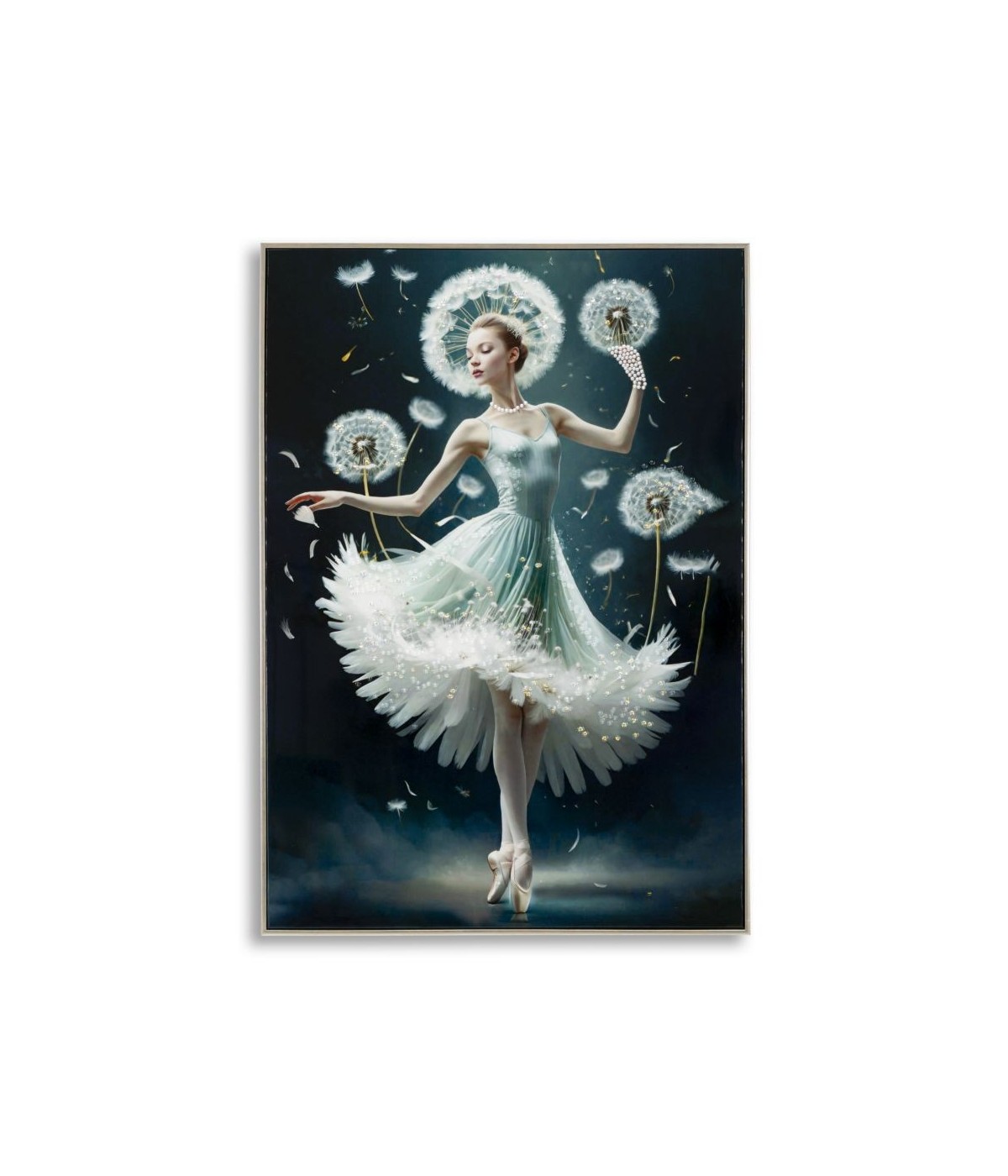 Dipinto su tela laccato con cornice Dancing esprime grazia e leggerezza con un tocco di magia. La ballerina eterea, avvolta in un abito che ricorda soffici piume, danza tra soffioni fluttuanti, evocando libertà e sogno. Perfetto per ambienti eleganti e raffinati.