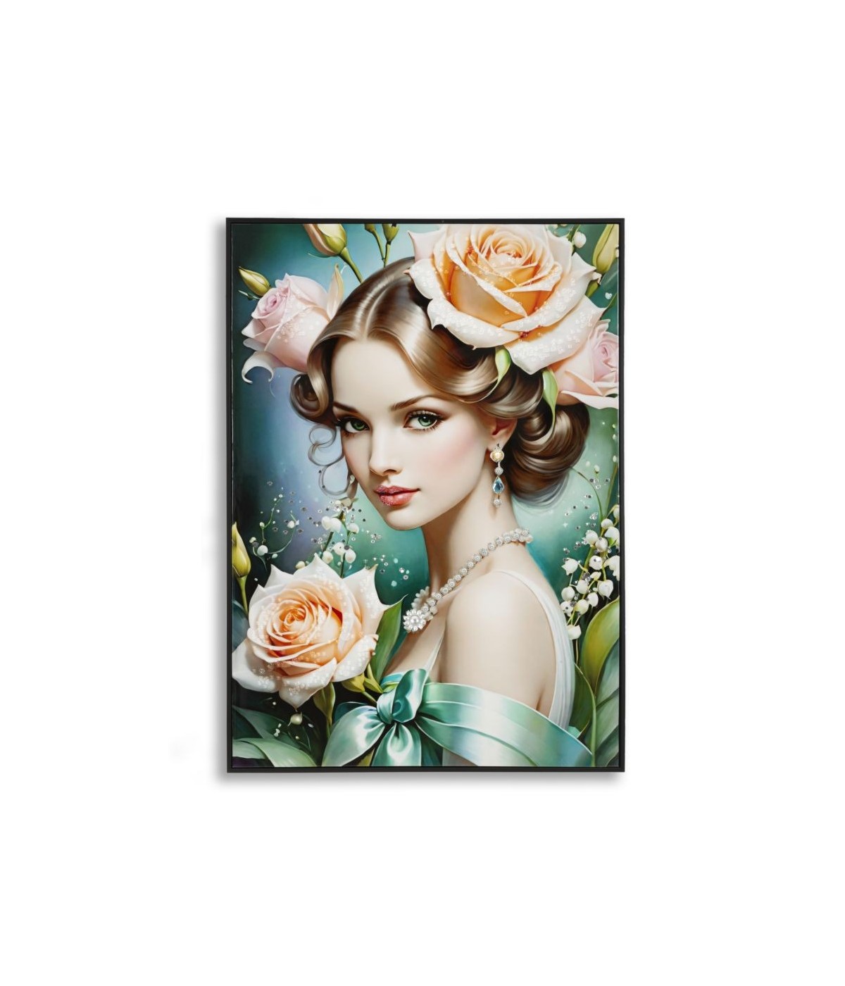 Dipinto su tela laccato con cornice Fantasy incarna eleganza e fascino onirico. Il ritratto femminile, impreziosito da perle e delicate rose, trasmette un’aura romantica e sofisticata. Perfetto per ambienti raffinati, aggiunge un tocco di magia e bellezza senza tempo.
