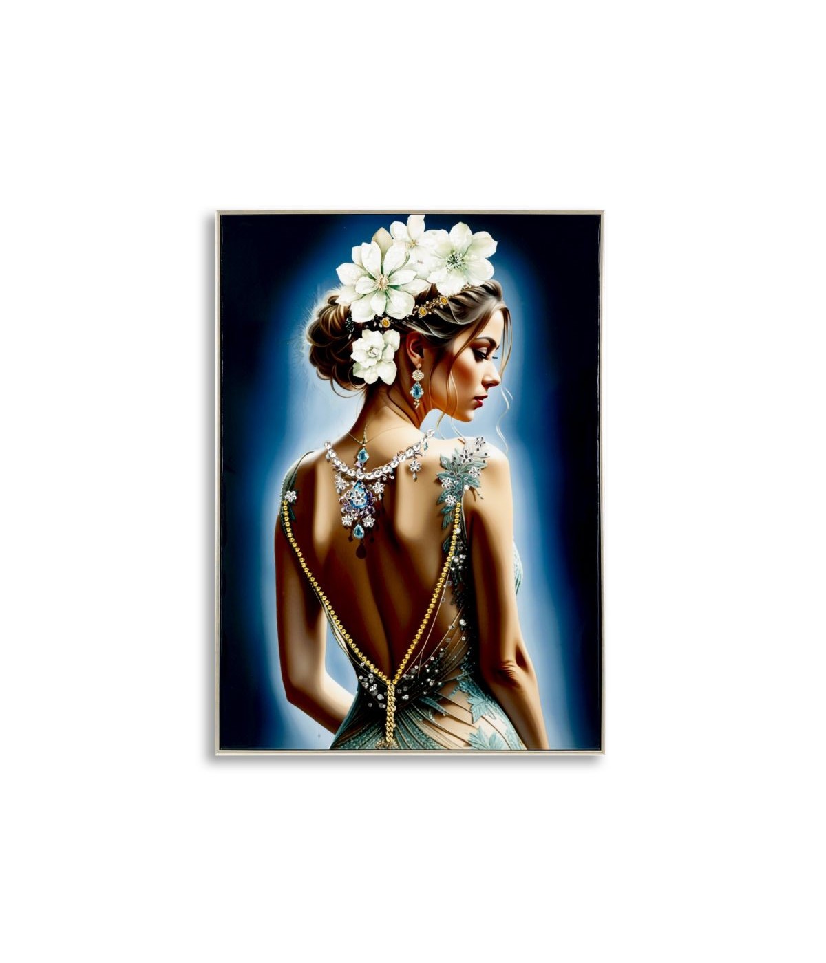 Dipinto su tela laccato con cornice Isabel esprime eleganza e raffinatezza senza tempo. La figura femminile, adornata con fiori e gioielli scintillanti, trasmette grazia e lusso. Perfetto per ambienti sofisticati, aggiunge un tocco di charme e femminilità.